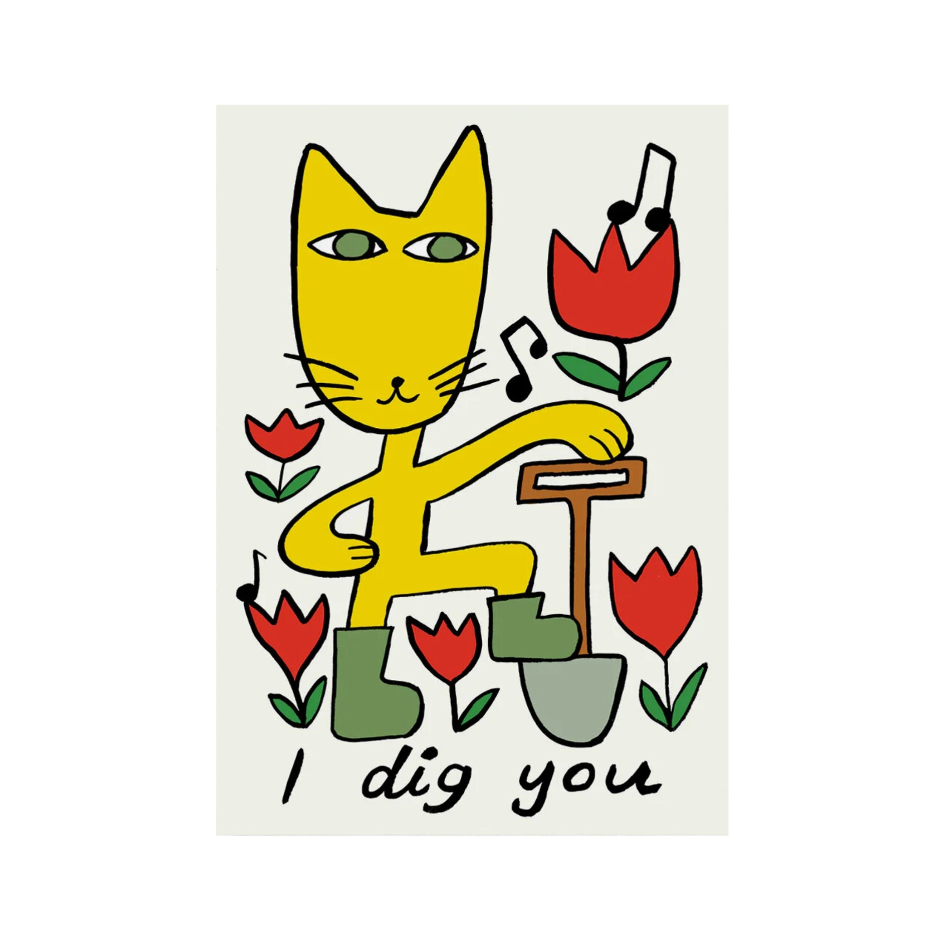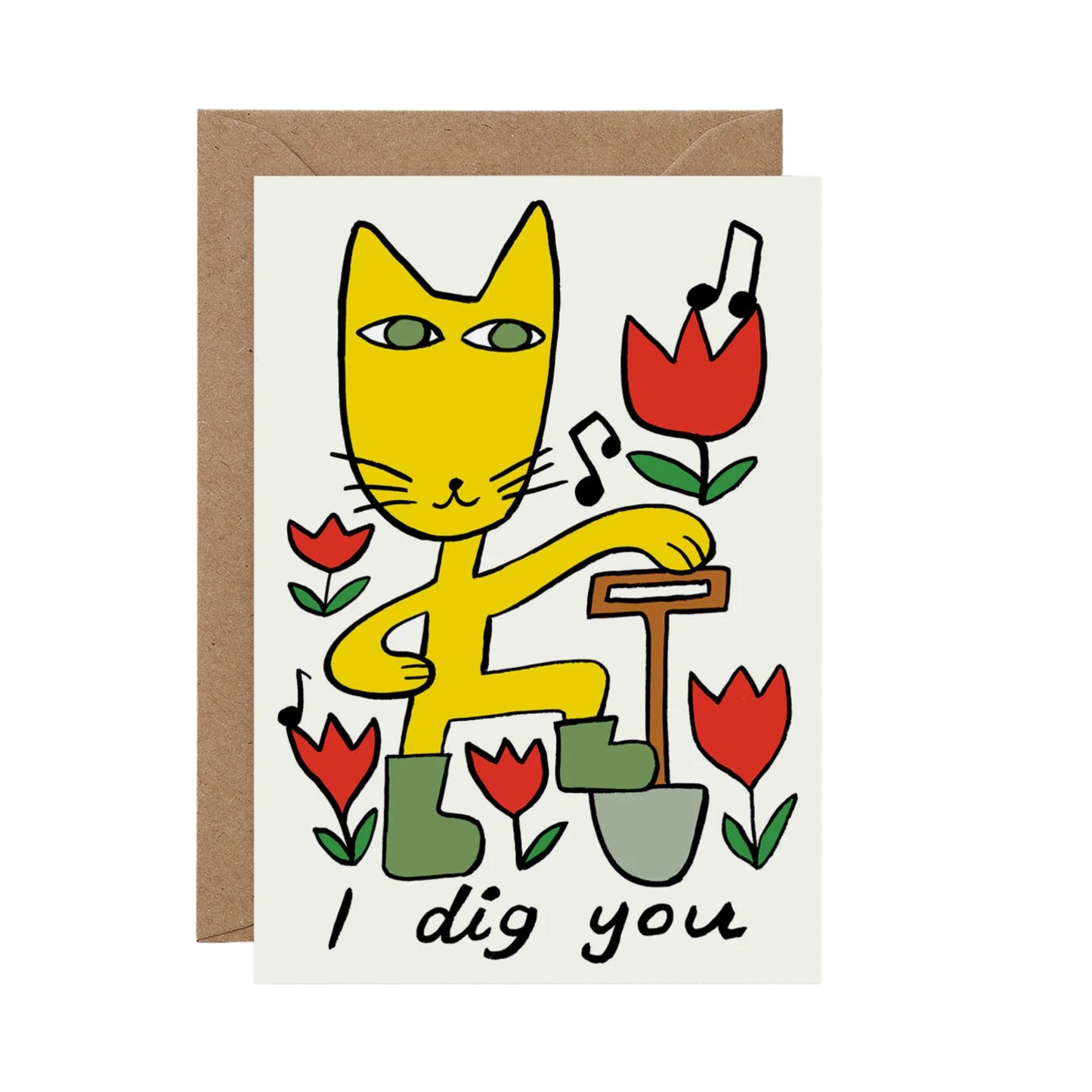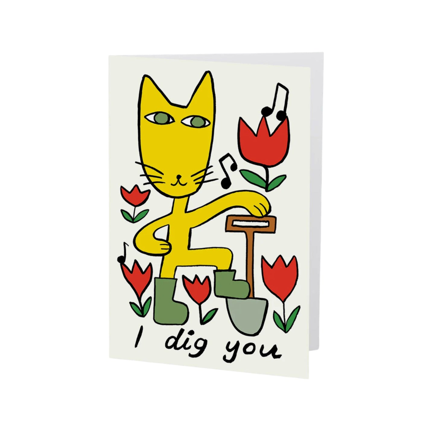 Show your love with this cute cat illustration I Dig You card. This UK printed greeting card features an embossed design, designed by Molly Fairhurst.