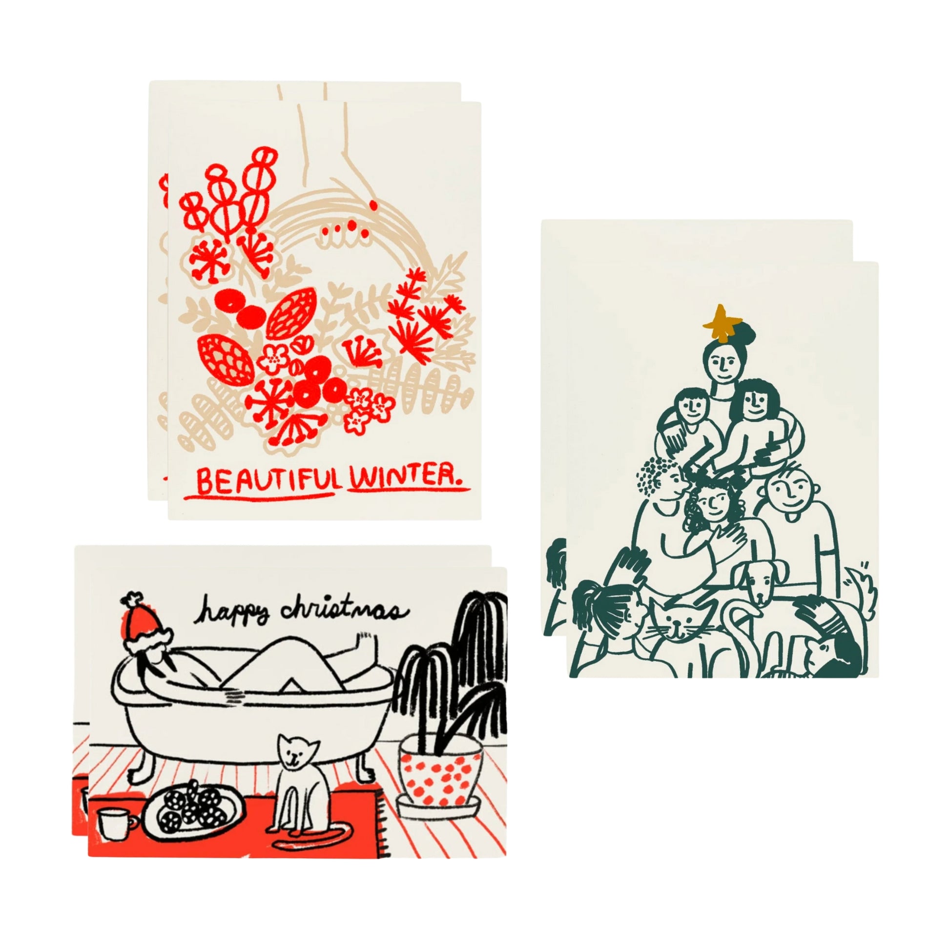 Not everyone you're sending you Christmas wishes to has the same style. Opt for this set of six cards to mix it up and spread that seasonal joy in a way that they'll appreciate. All of these cards are letter-pressed by hand on archival-quality card stock with a snocone envelope.