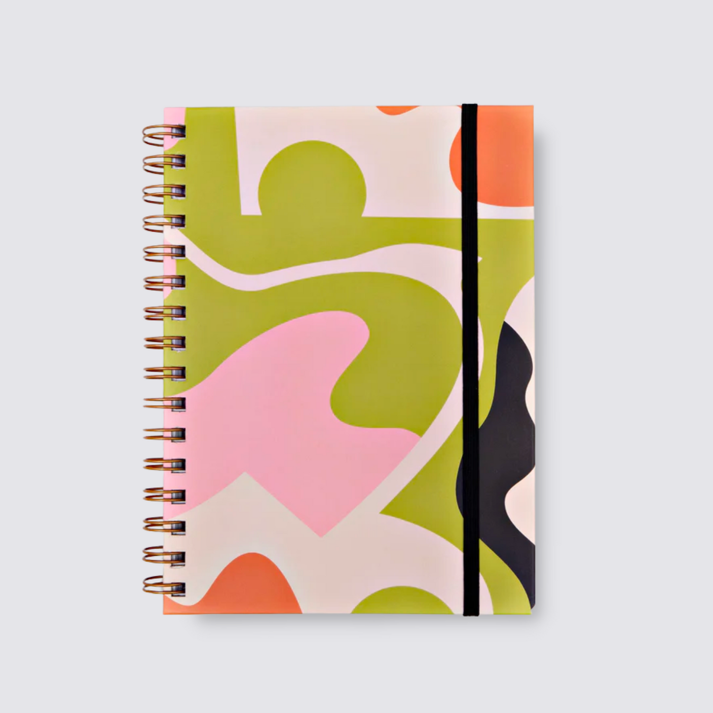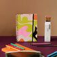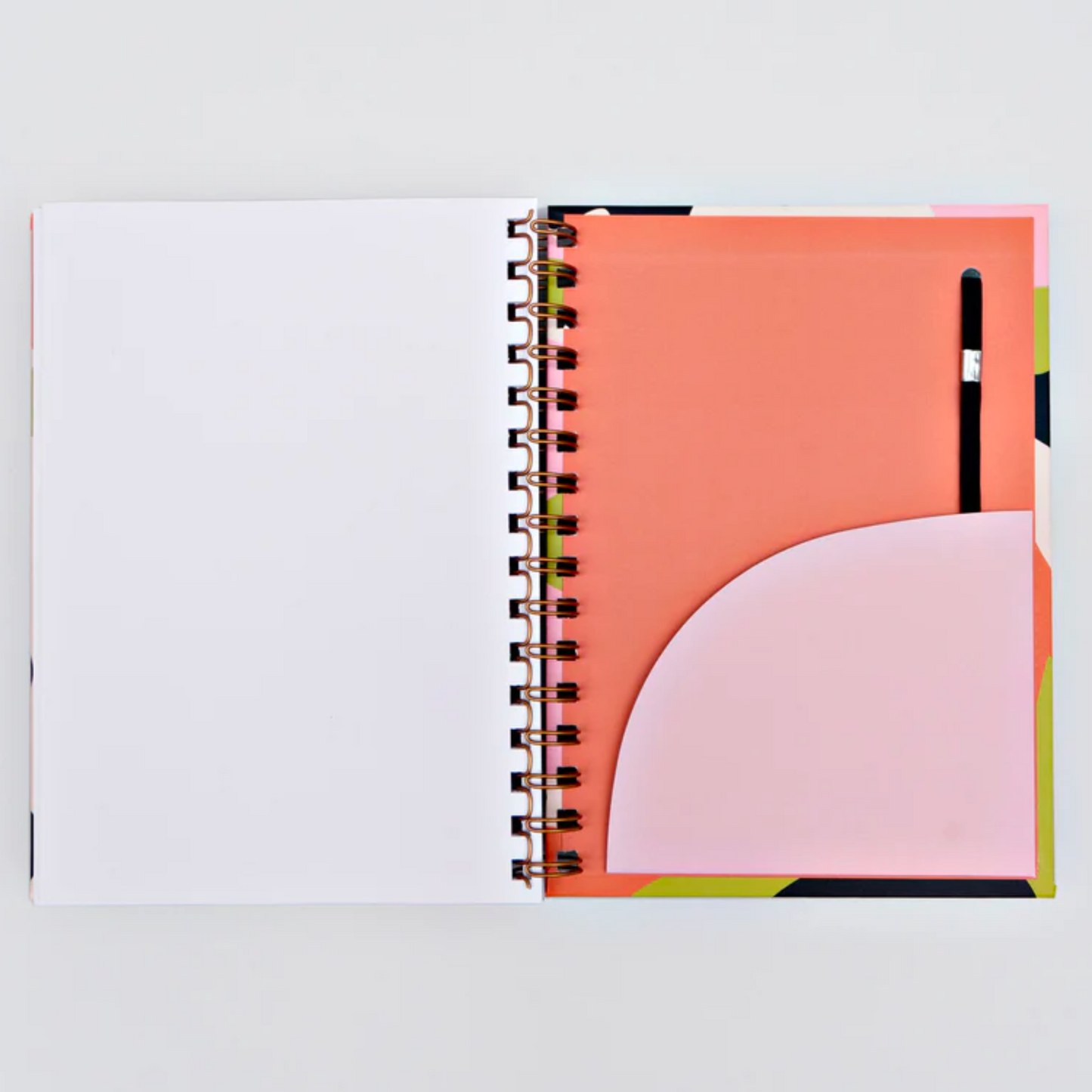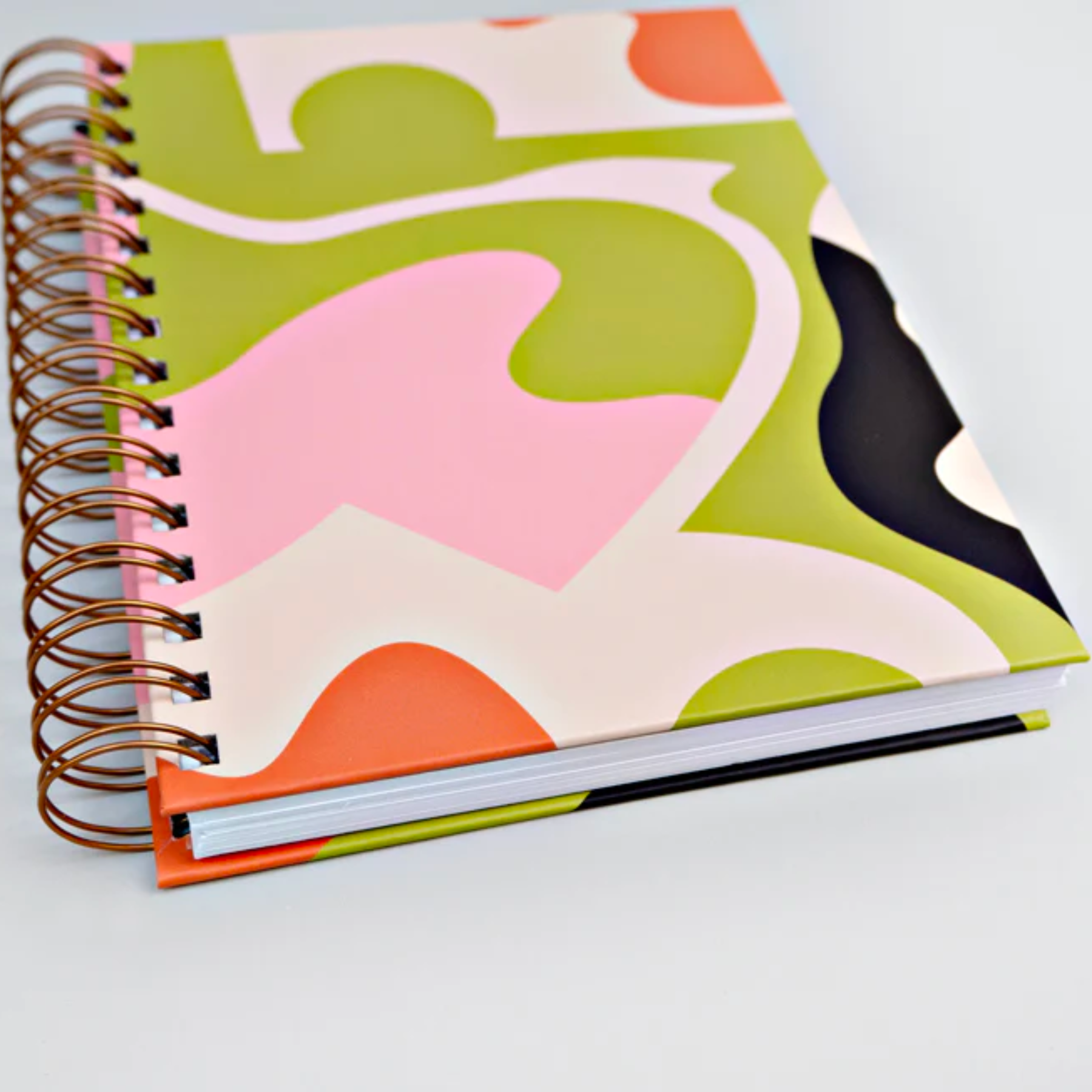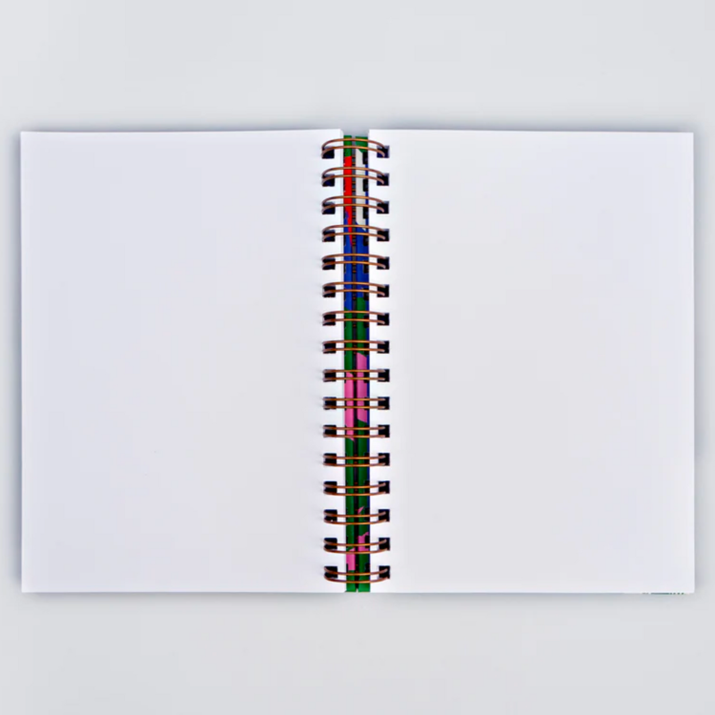Introducing the Juno A5 sketchbook. Featuring a 1960's print, with a robust hardcover with a stylish peach contrast inside. Crafted in the UK and hand-finished in London, this wire-bound sketchbook presents 160 plain, high-quality 120gsm textured FSC-certified paper pages, providing the perfect canvas for various artistic pursuits such as sketching and painting. The elastic closure and back pocket ensure security and organization on the go.