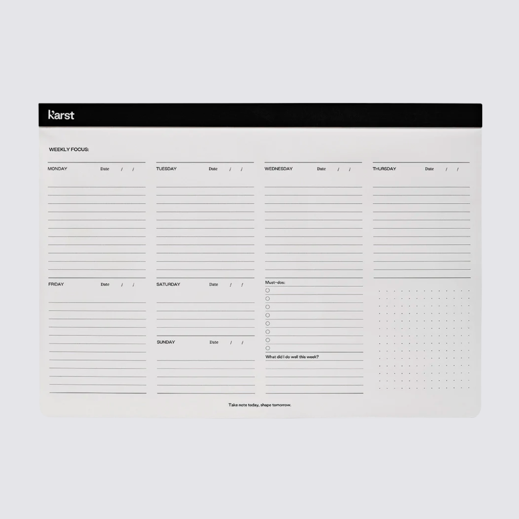 With space to track your non-negotiable tasks for the week, a weekly reflection, and a dot grid area for sketches or notes, stay on top of it all with ease. Perfect for everyday use.