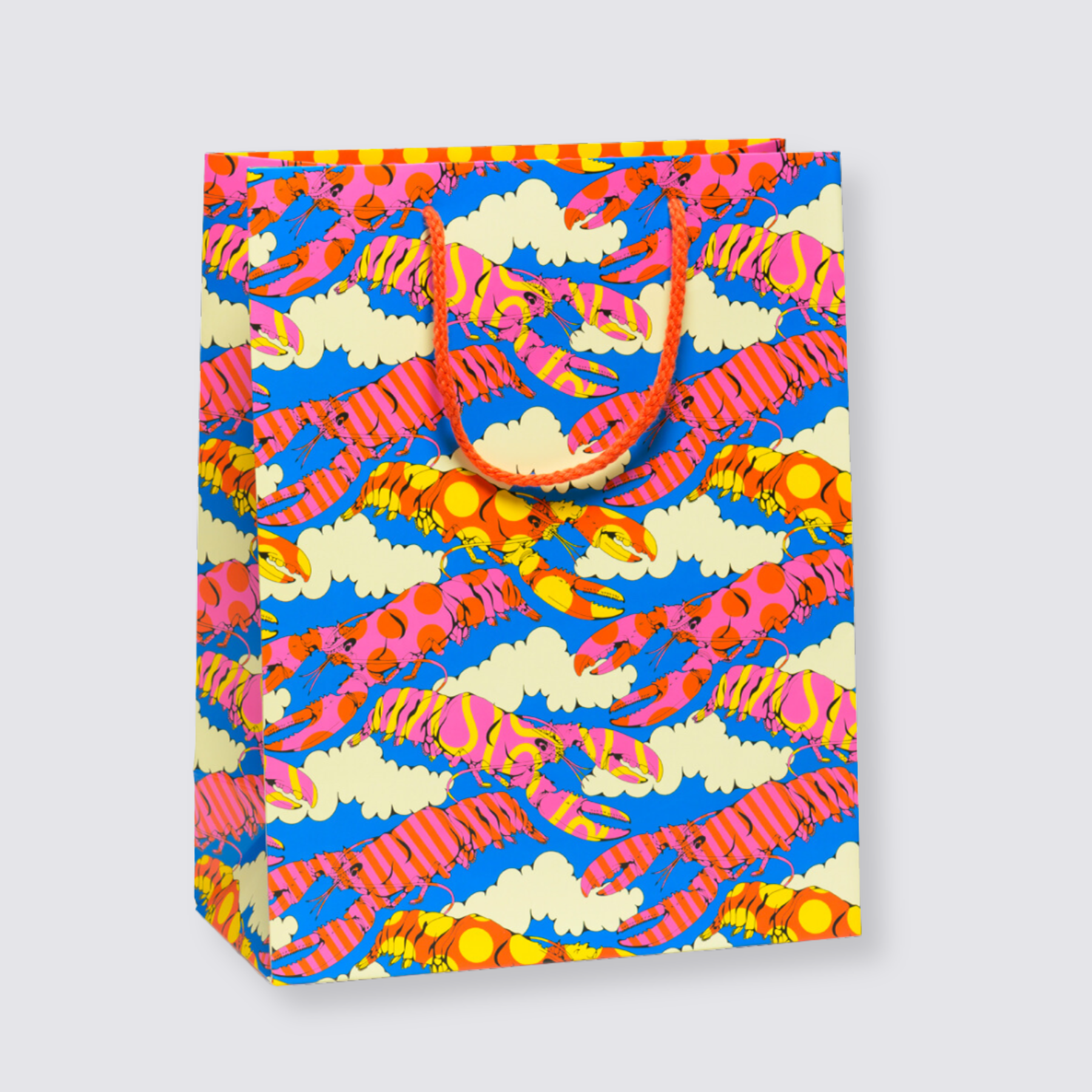 A fantasy-themed lobster illustrated gift bag to gift only the best treats inside. This large gift bag has a robe handle and a colourful lobster print.