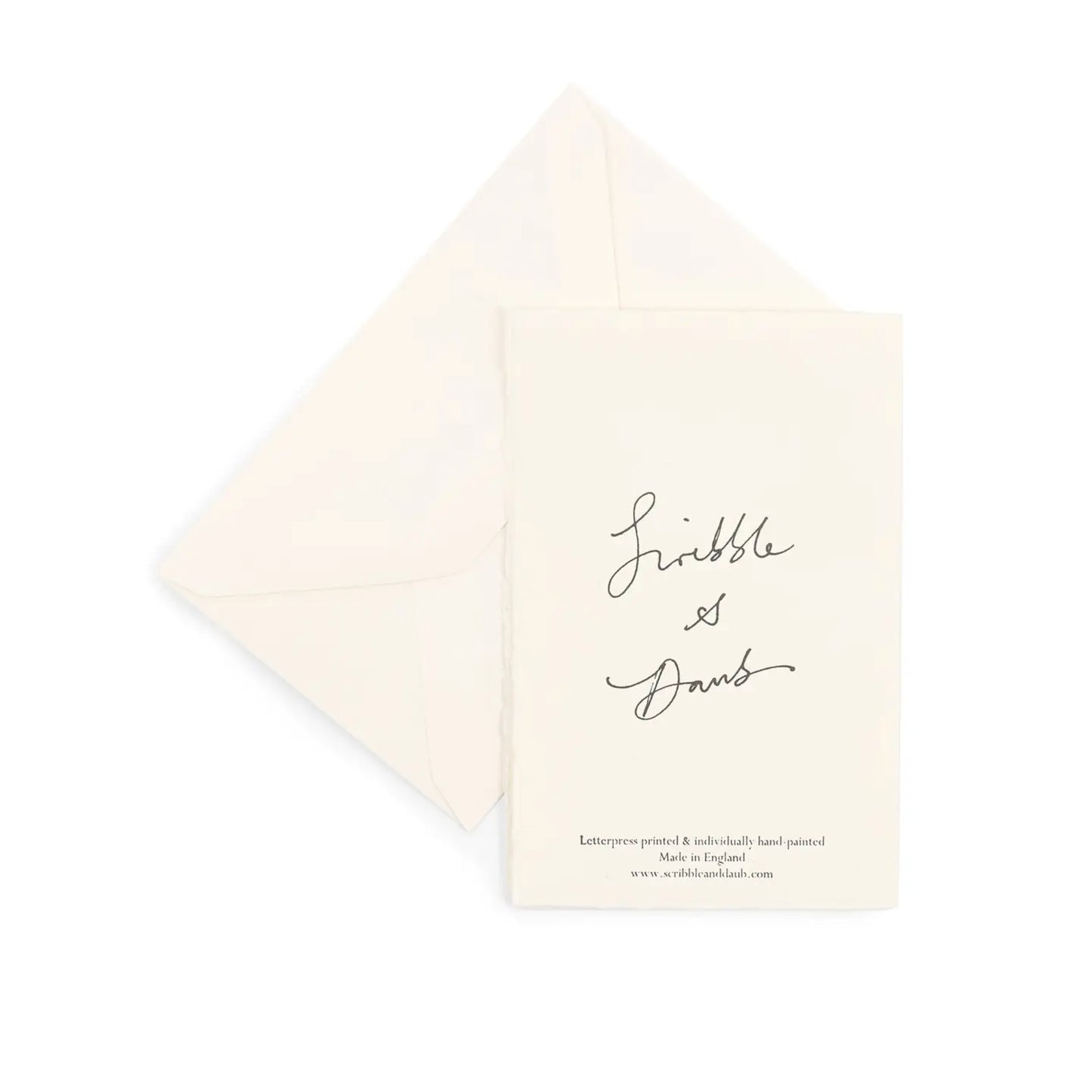Scribble & Daub cards are traditionally letterpress-printed from original dip pen and ink drawings and then individually hand-painted with Andy Warhol’s favourite inks on luxurious Italian deckle-edged cards with matching envelopes.