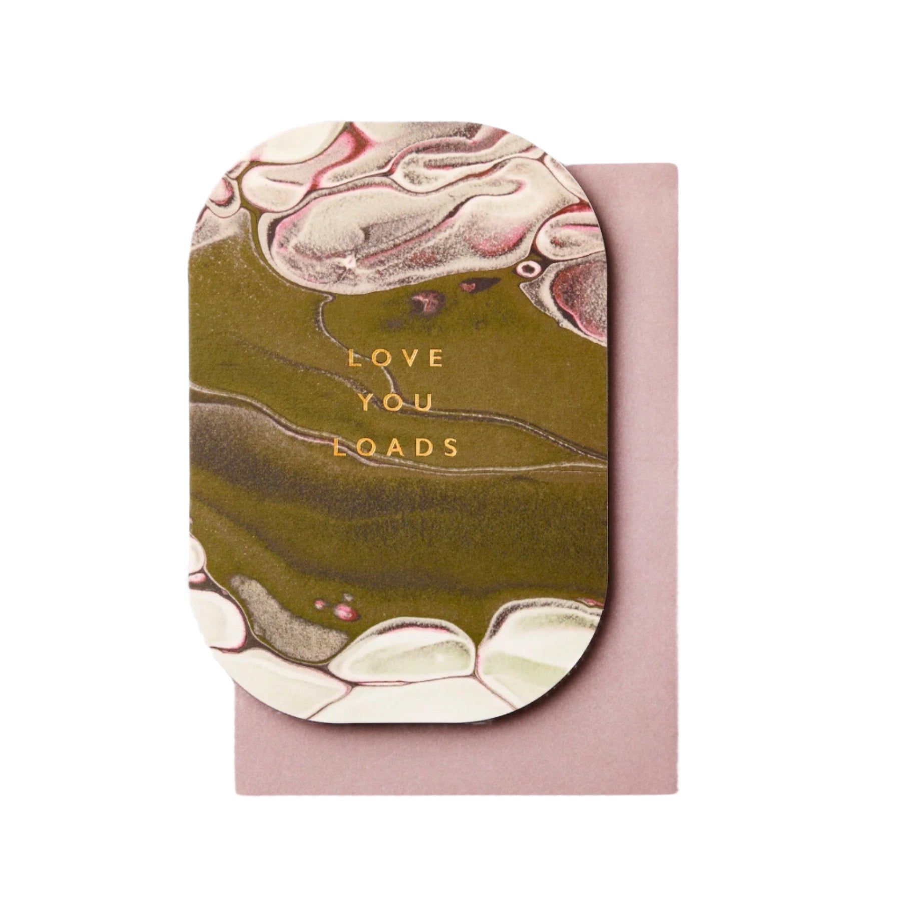 This unique, pebble-shaped card is a beautiful way to say i love you. On the front is goil foiled text that says 'Love you loads' and inside is blank. It comes with a soft light pink envelope to match.
