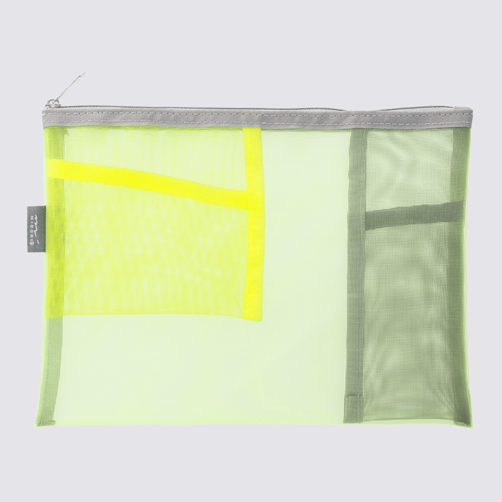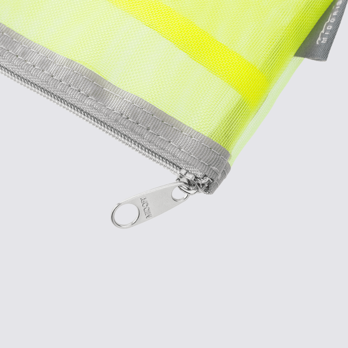 This yellow and green mesh pencil case holds all your stationery tools, whilst laying flat on your desk space. Ideal for sorting your writing implements and other small items. This pouch is made from a light mesh material, making it easy to see the items inside. You can take a quick peek at what tools you have, without burrowing around inside. It’s the perfect way to show off your new stationery too!