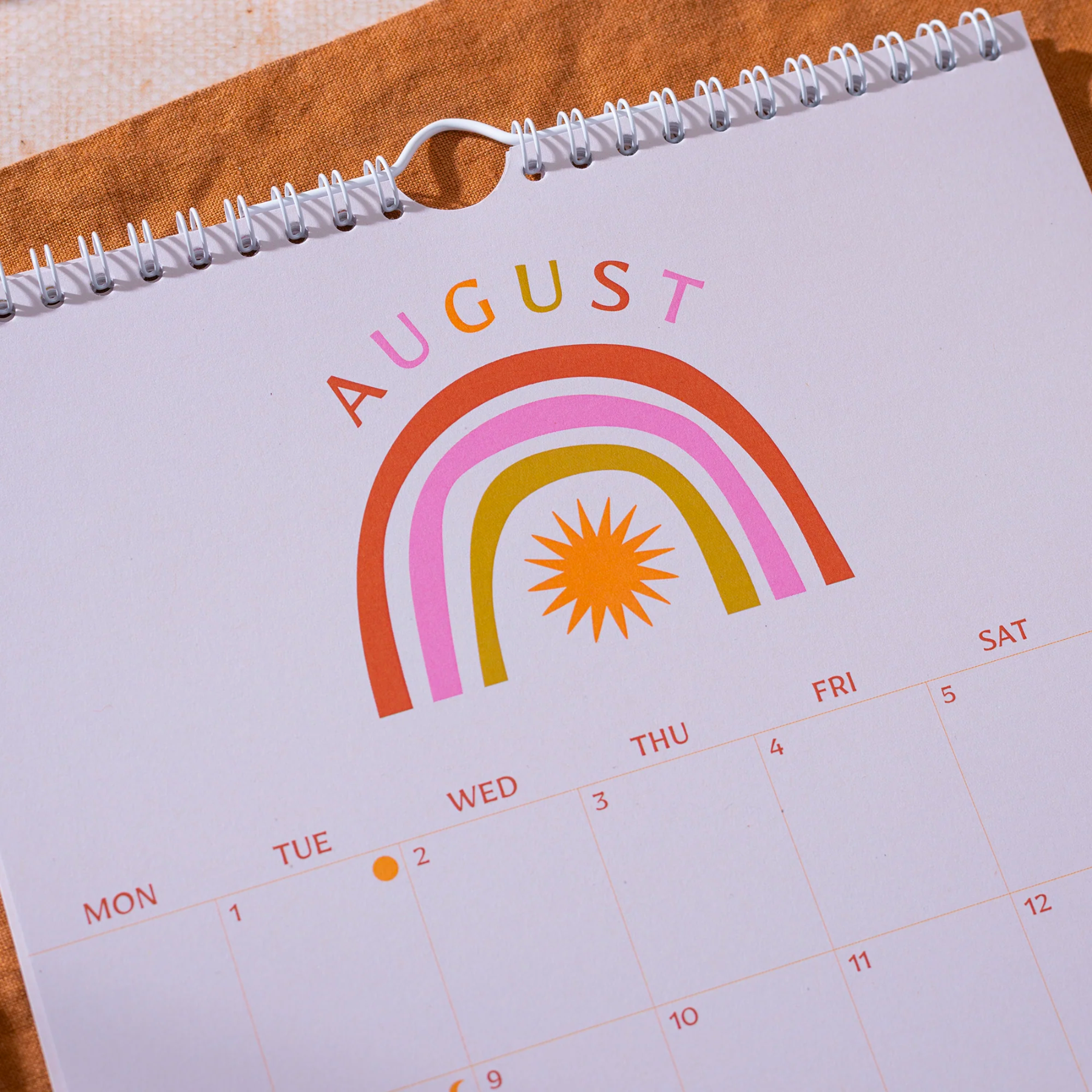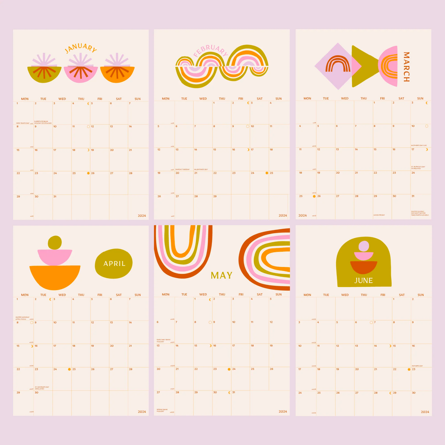 The Rainbow Shapes calendar adds a pop of colour to your space and each month features a new abstract art inspired design in modern colours. The monthly date grid also includes week numbers, moon phases and UK bank holidays.