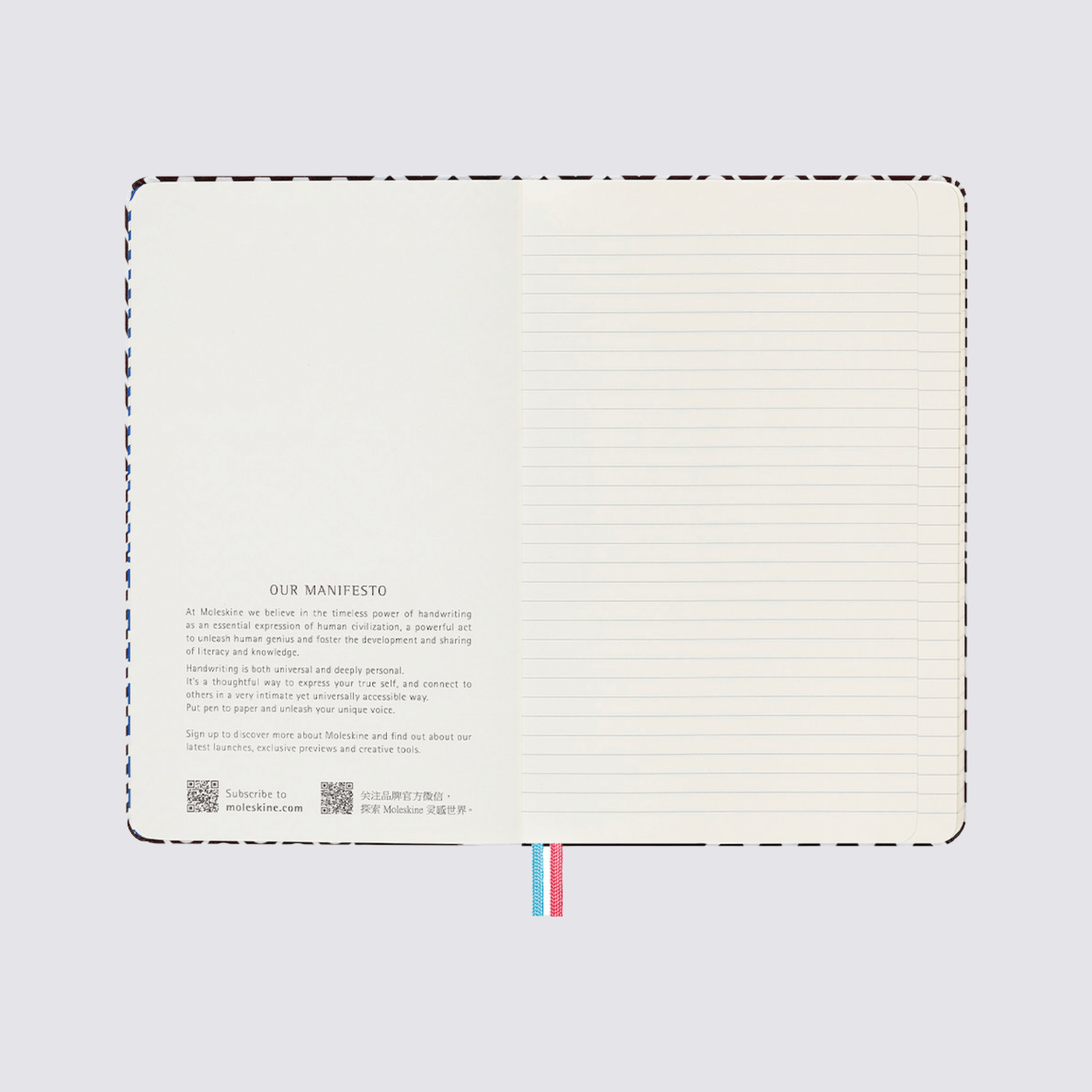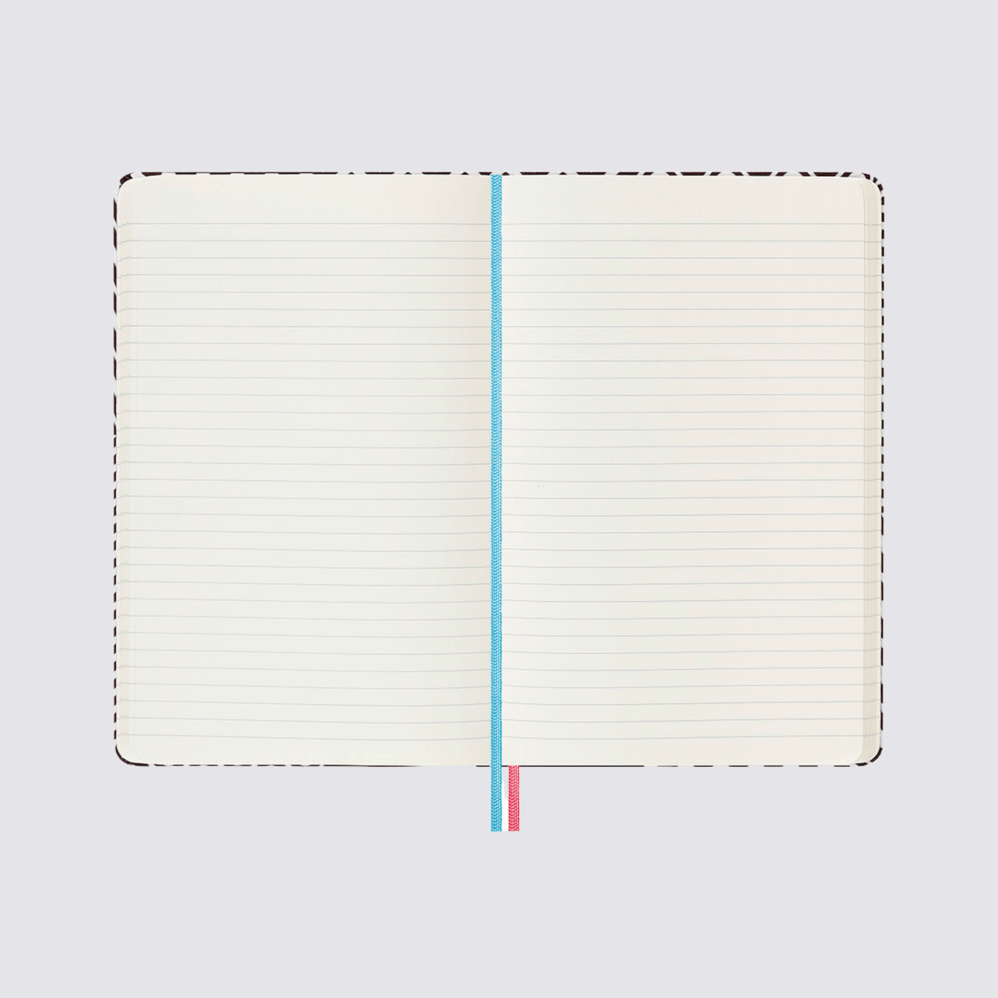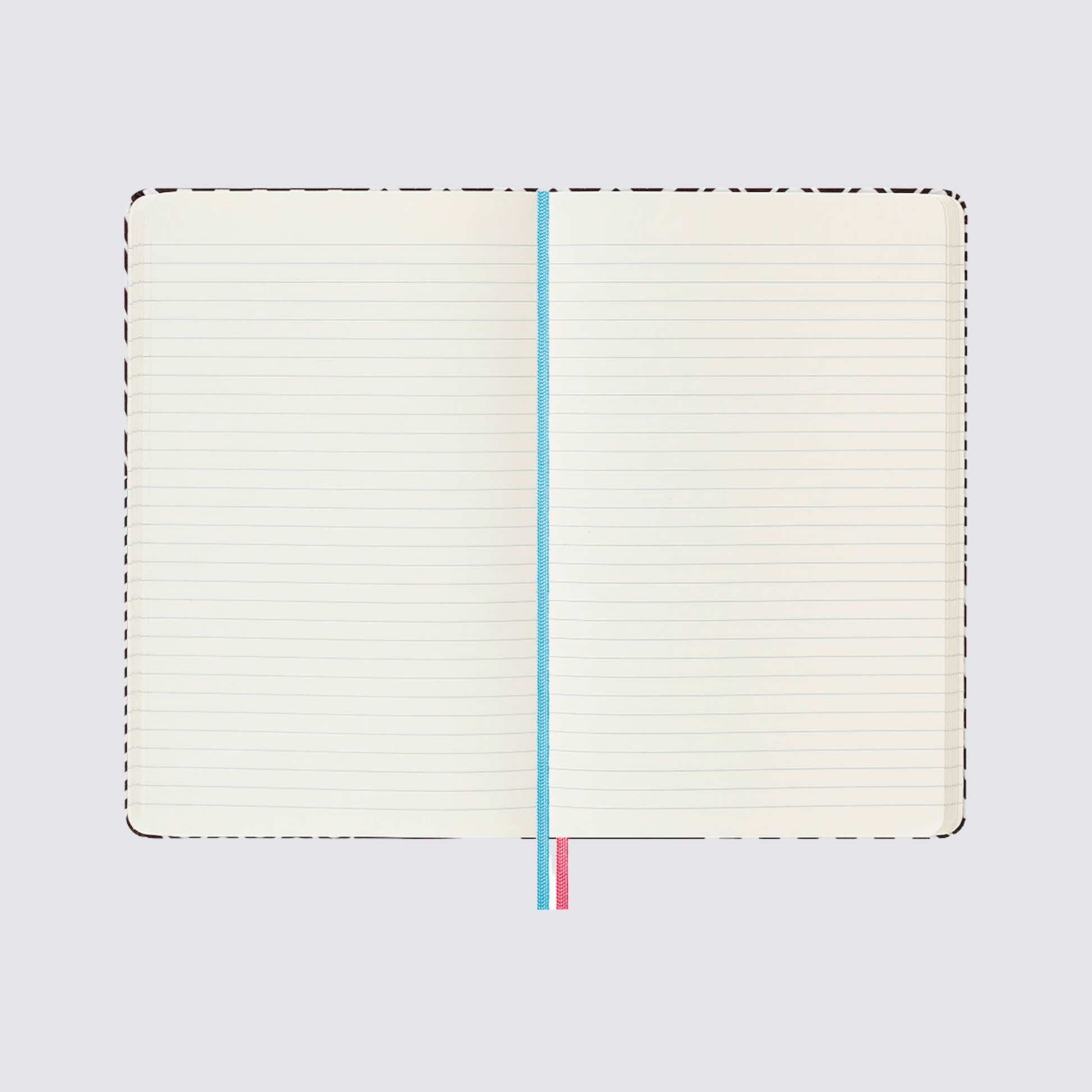 This large ruled hardcover notebook has a subtle jacquard print on the front and a contrasting orange zigzag pattern on the inside cover. The hardcover keeps your pages flat and firmly in place with the help of a contrasting lime elasticated band. Find your page with blue and orange ribbons to match the patterns, bringing together a pleasing design.