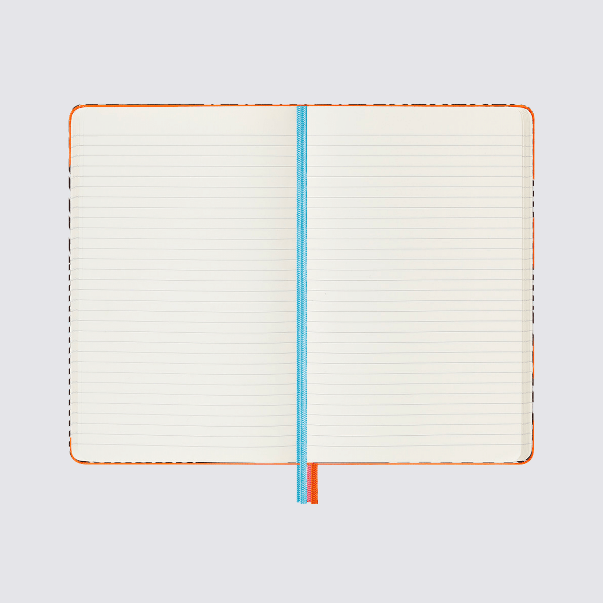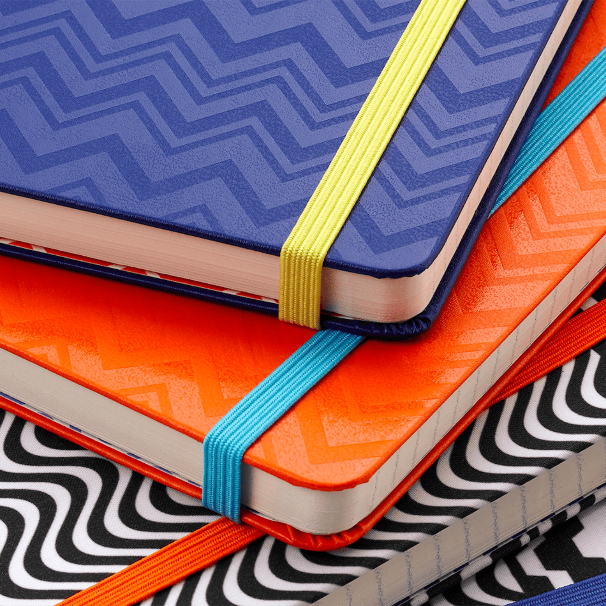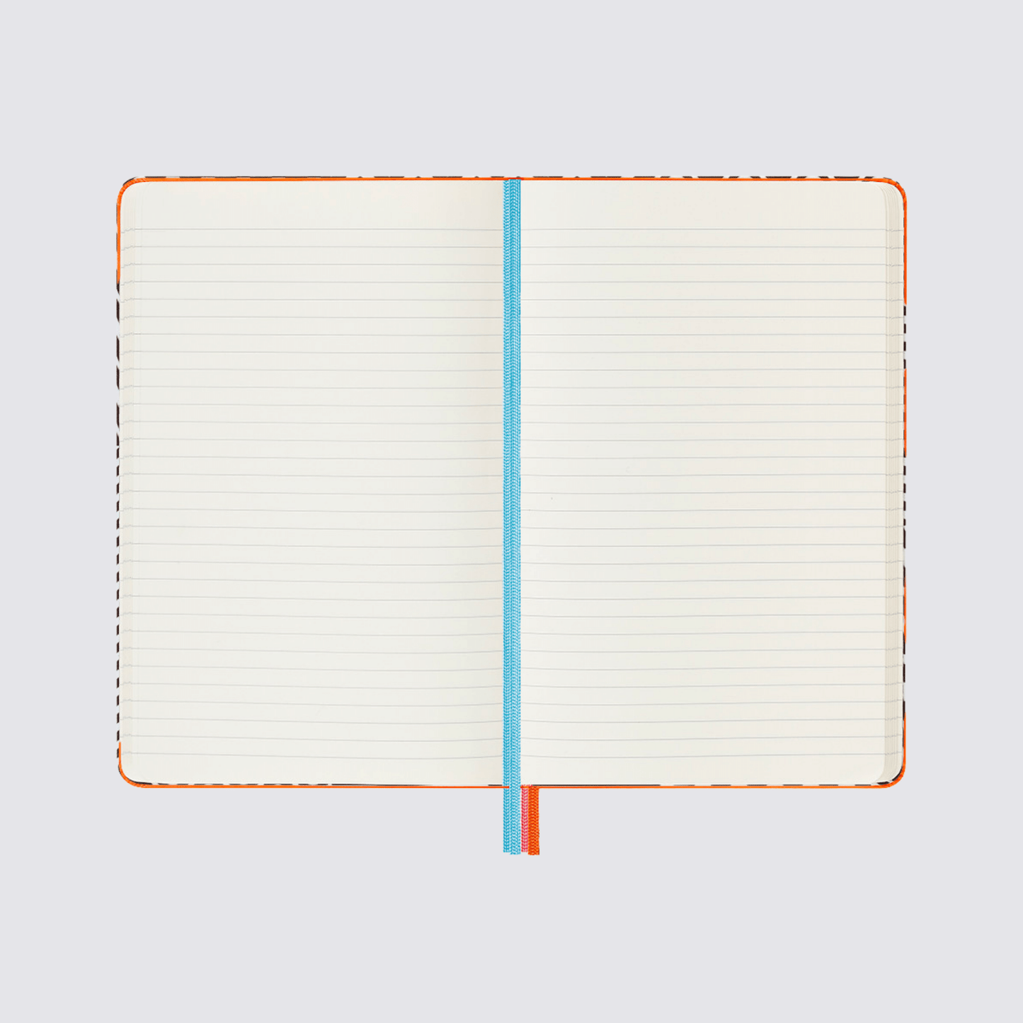 This large ruled hardcover notebook has a subtle woven zigzag print on the front and a contrasting abstract pattern on the inside cover. The hardcover keeps your pages flat and firmly in place with the help of a contrasting blue elasticated band. Find your page with blue and orange ribbons to match the patterns, bringing together a pleasing design.