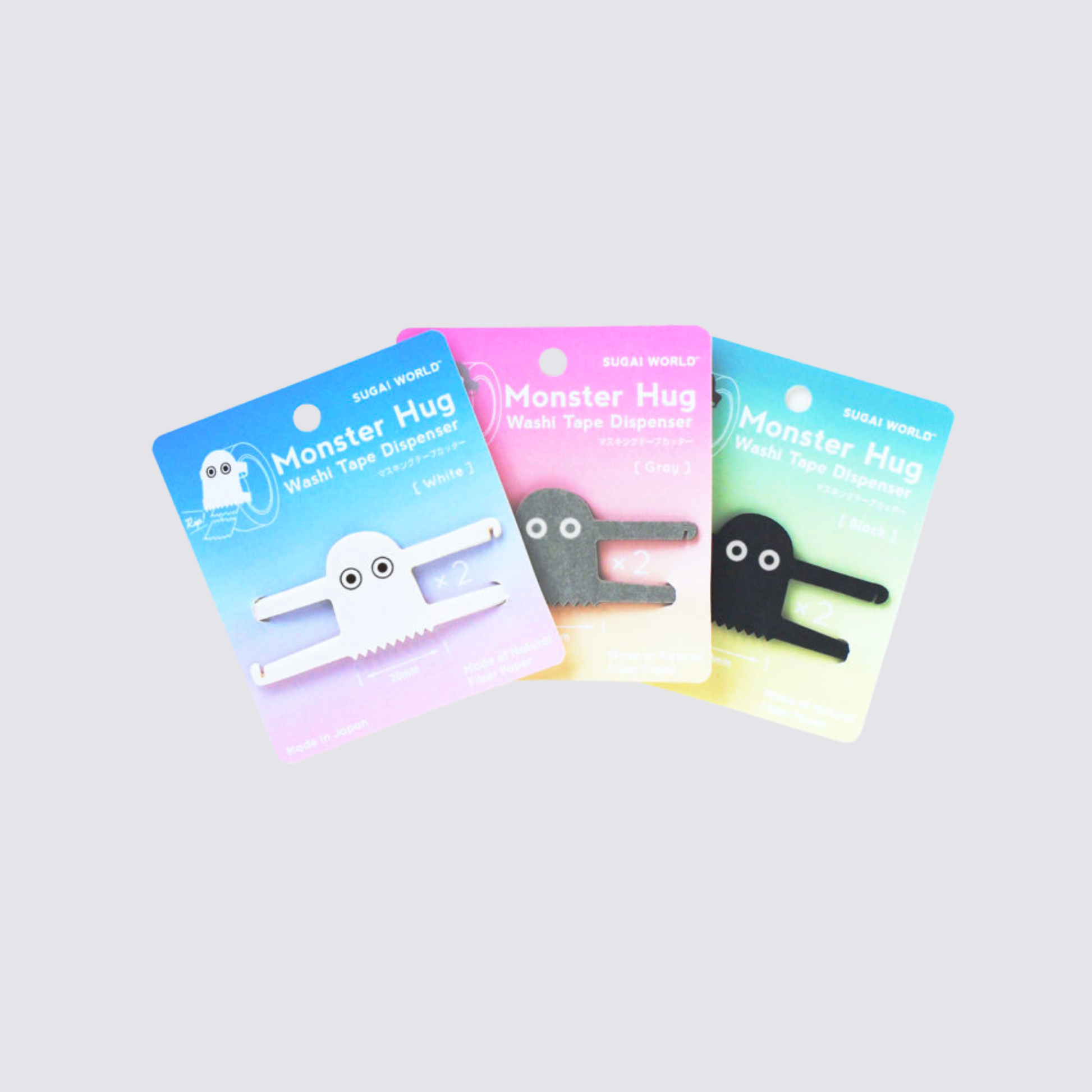 Monster Hug is an Monster-shaped portable washi tape dispenser. Attach the Hug around a roll of tape by gently bending the monster’s legs. Roll out the tape and rip with the jagged edge located on the Monster bottom. The appearance of the Monster tightly hugging a roll of tape is very humorous. Attached to your favorite colored tape, it becomes a fun little tabletop decoration. Hugs are entirely made of natural fiber paper, so it is soft to the touch and safe. The paper is biodegradable and environmentally friendly. Lightweight and compact, they are portable and easy to store attached to the tape. They are wonderful company for you, and make great gifts for friends and family!