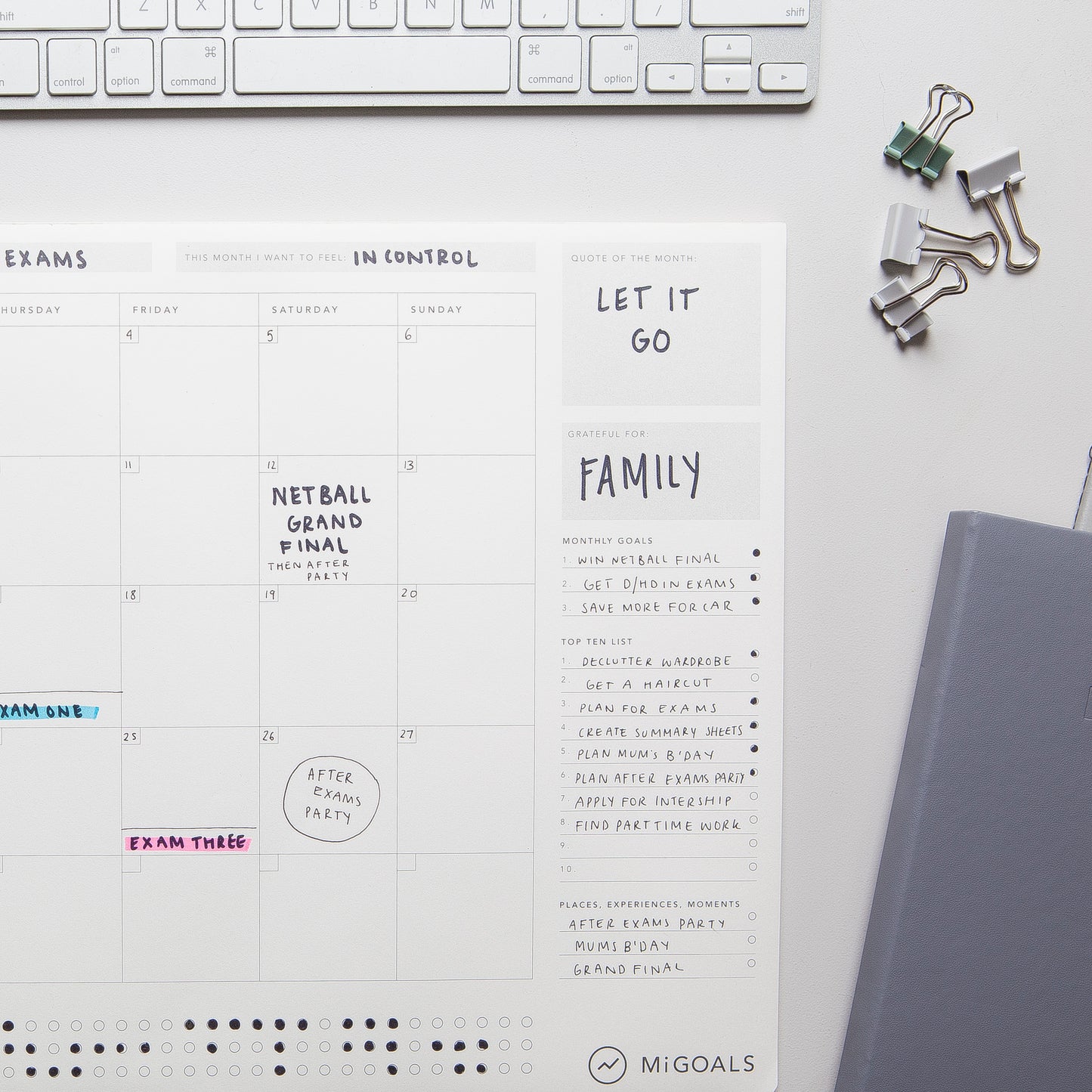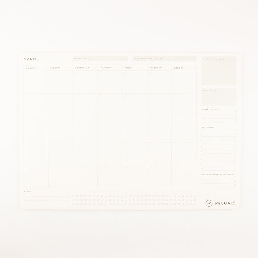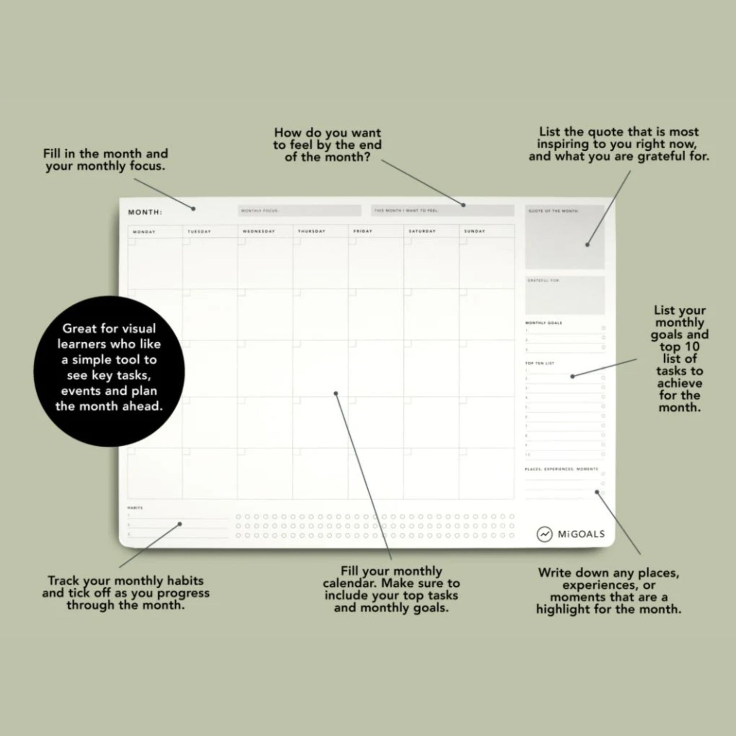 The monthly desk planner is your visual reminder of the key things you need to do to help you execute your goals whilst you work from home.
