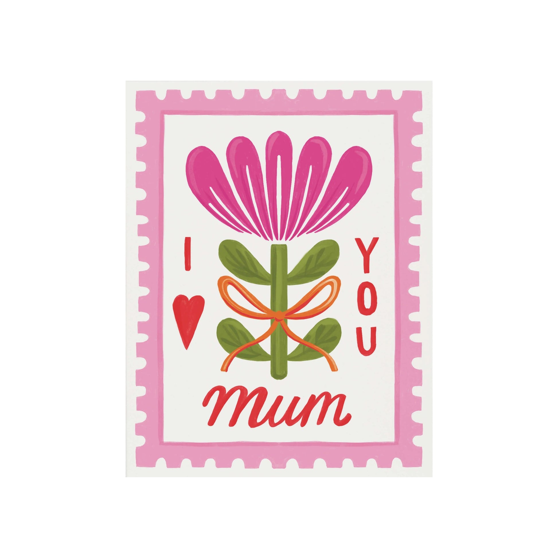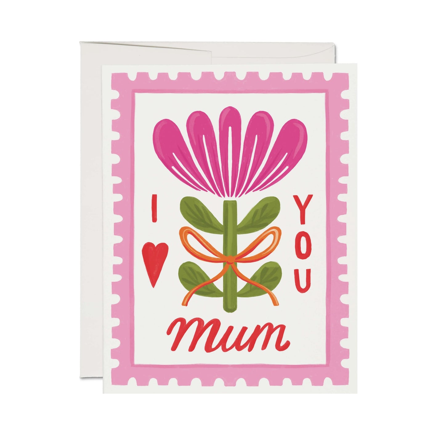 A cute and sentimental card for mum, illustrated by The House That Lars Built. Featuring a floral design with a bow in pinks, red and green. On the front it says I love you mum.