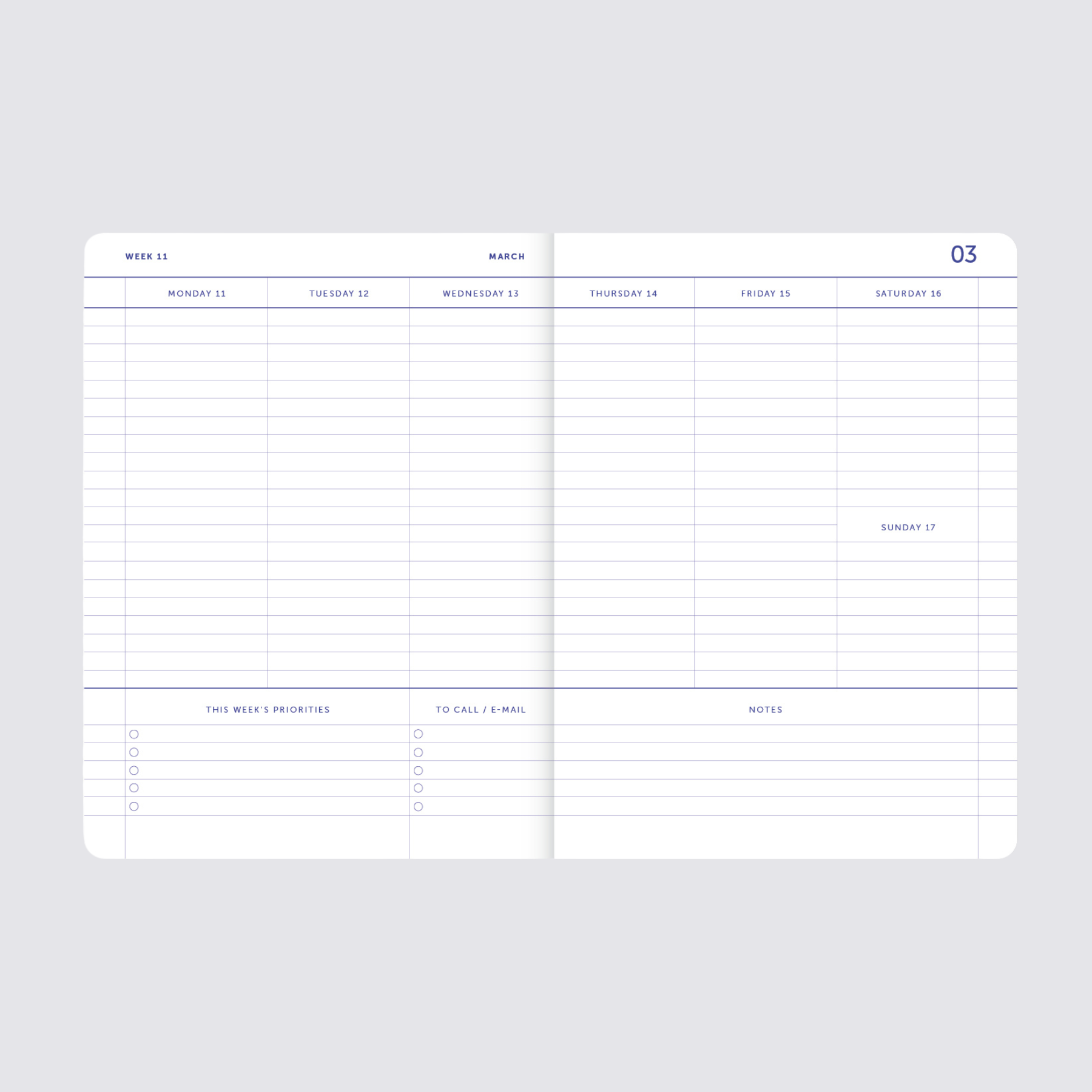Weekly Spread: Plan your weeks efficiently with ample space.