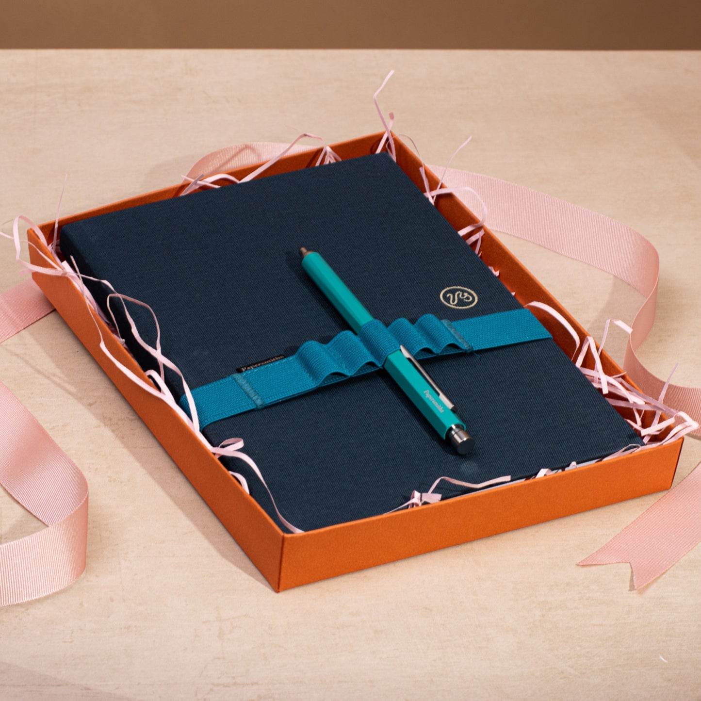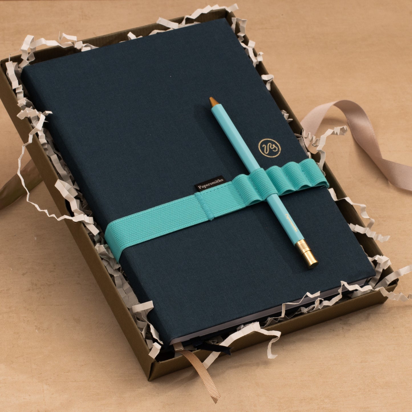 This Navy Hardback Notebook, Pen and Band Trio includes:
