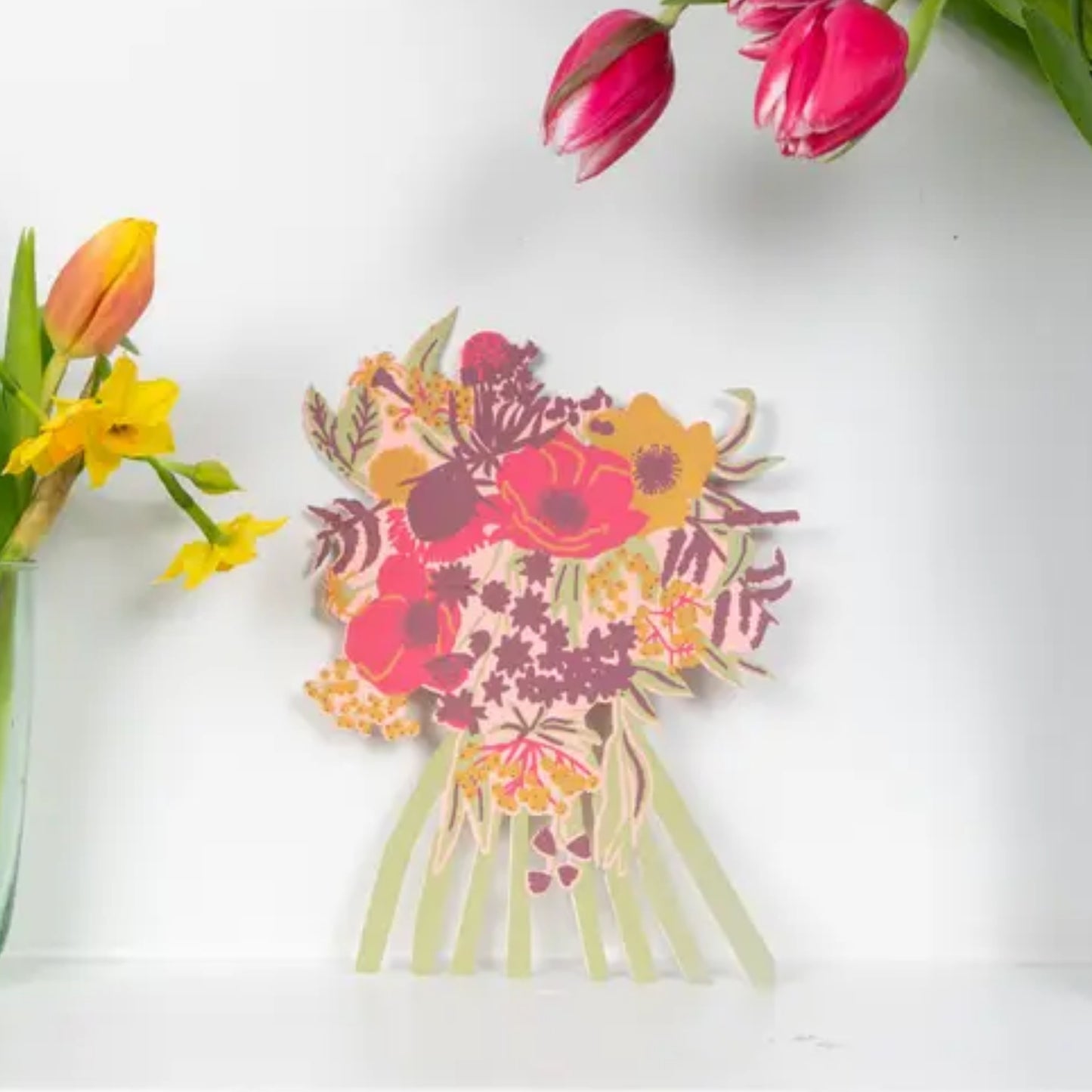 Say it with flowers—no vase required. This hand screen printed greetings card features a beautiful floral design and a panel on the reverse for your message, perfect for any heartfelt occasion.