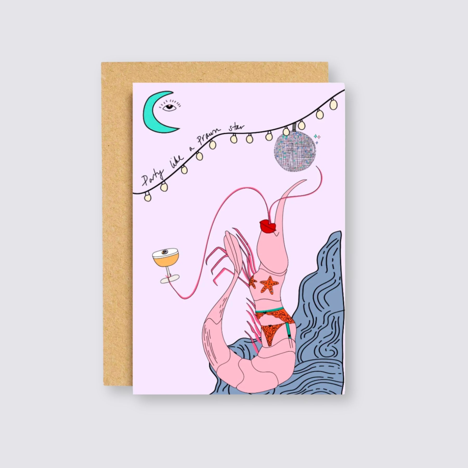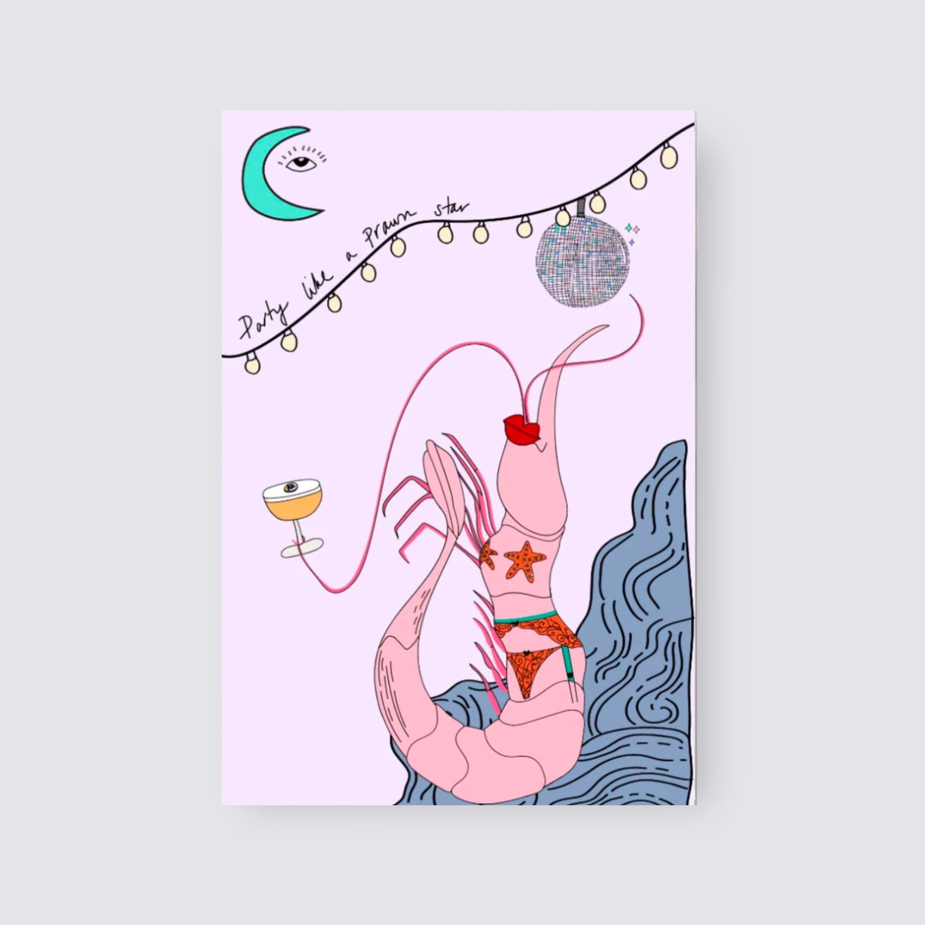 Party like a prawn star with this fun Eat the Moon prawn card. This funky prawn star illustration is here to wish someone a very happy birthday. It features a very stylish prawn living her best life.