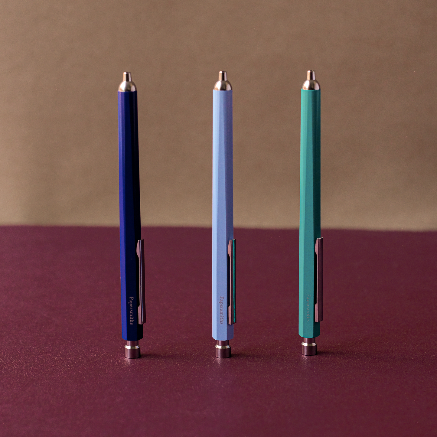 The sky hue set of Primo pens in ballpoint ink includes three pens. This set is presented gift ready in a Papersmiths gift envelope.
