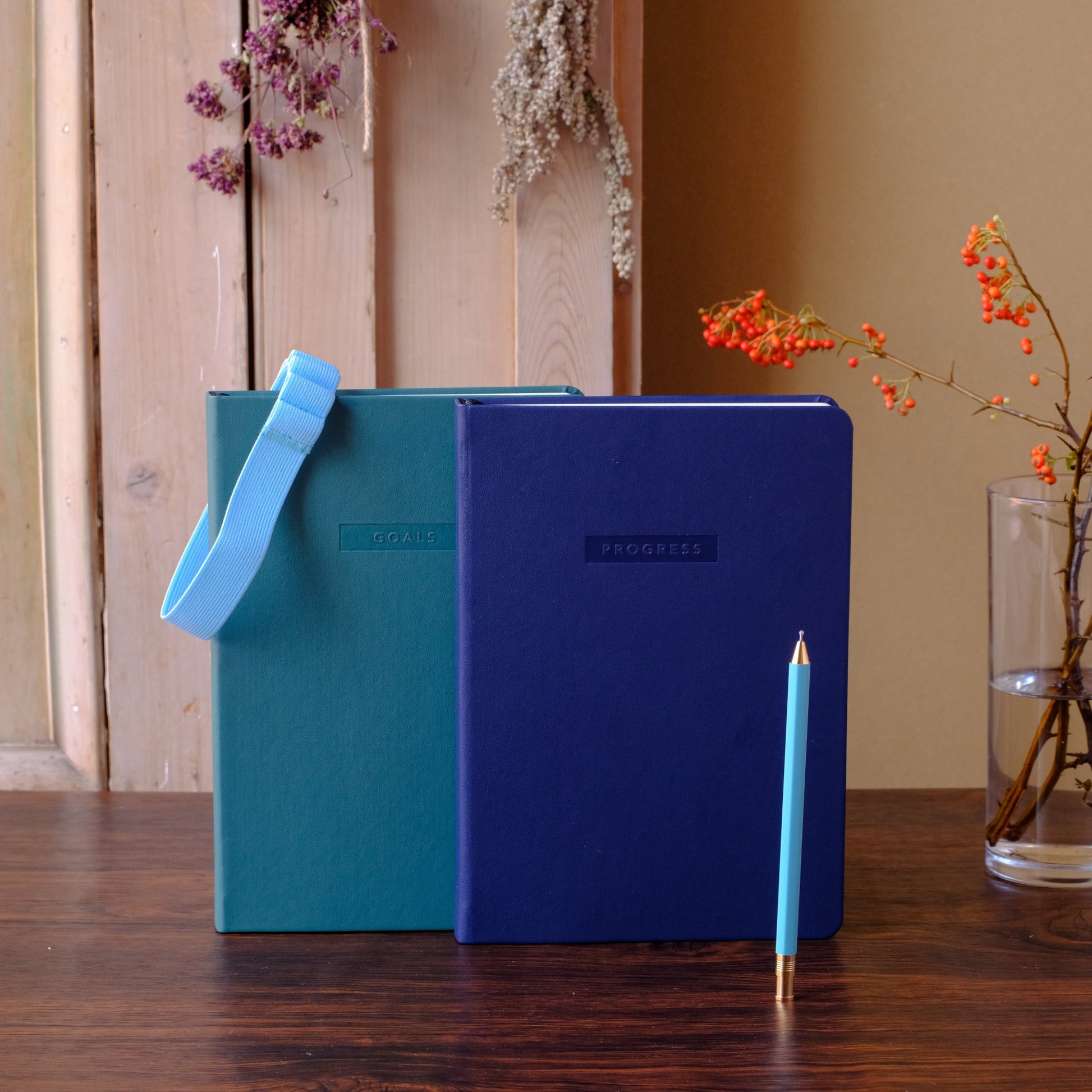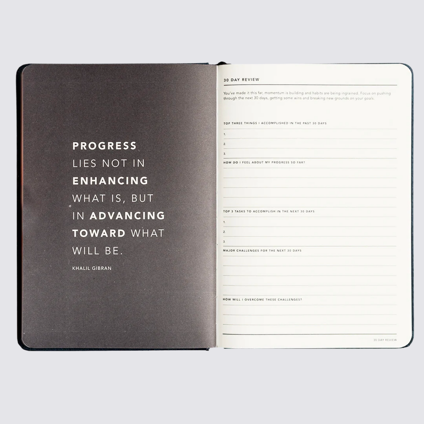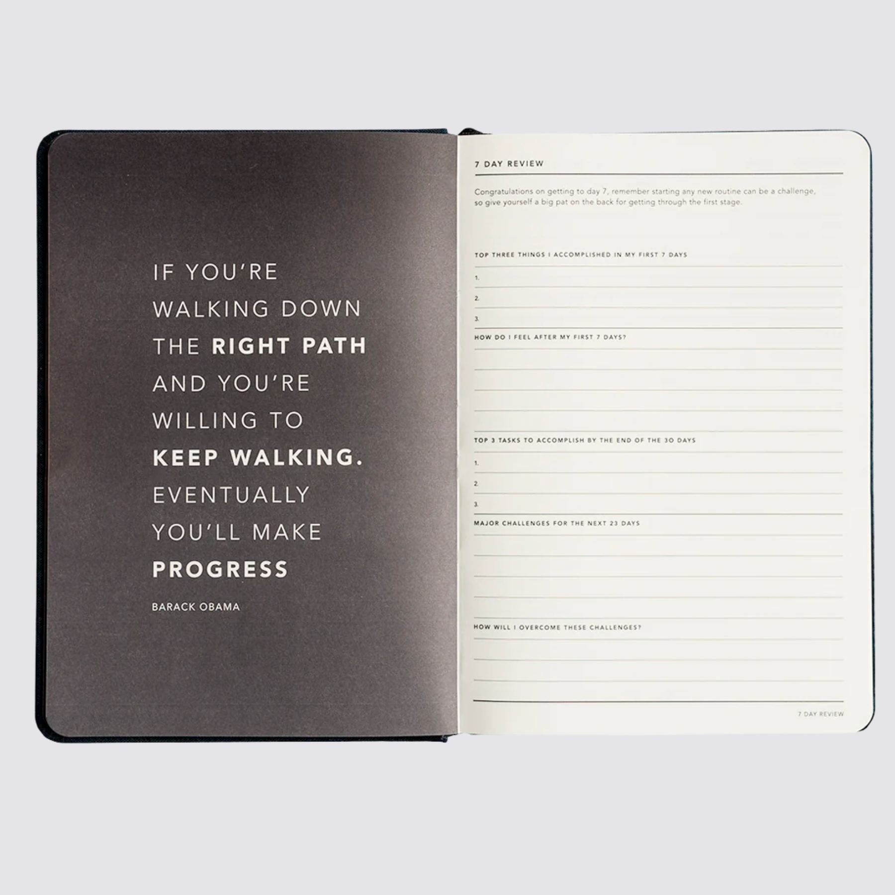 Our Progress Journals help you stay organised on a day to day basis. This Progress Journal in Navy Blue will motivate you to make the small steps towards your dreams and will set you on a path of task tracking, reflection and gratitude to develop new habits and set achievable daily goals.