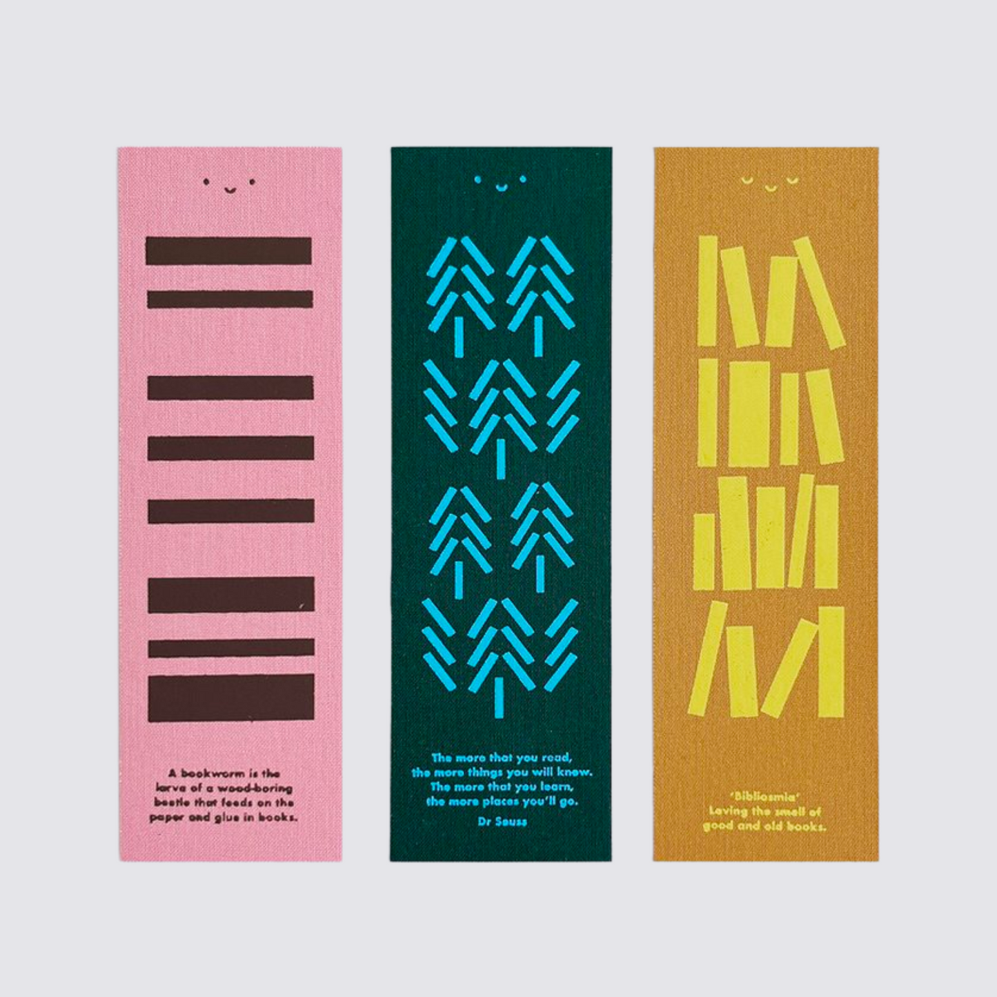 A series of bookmarks to accompany your latest read. Handmade and letter-pressed with contrasting colour, pattern and illustration onto book cloth. Each bookmark has a quote on the front. Would make the perfect gift for any bookworm.