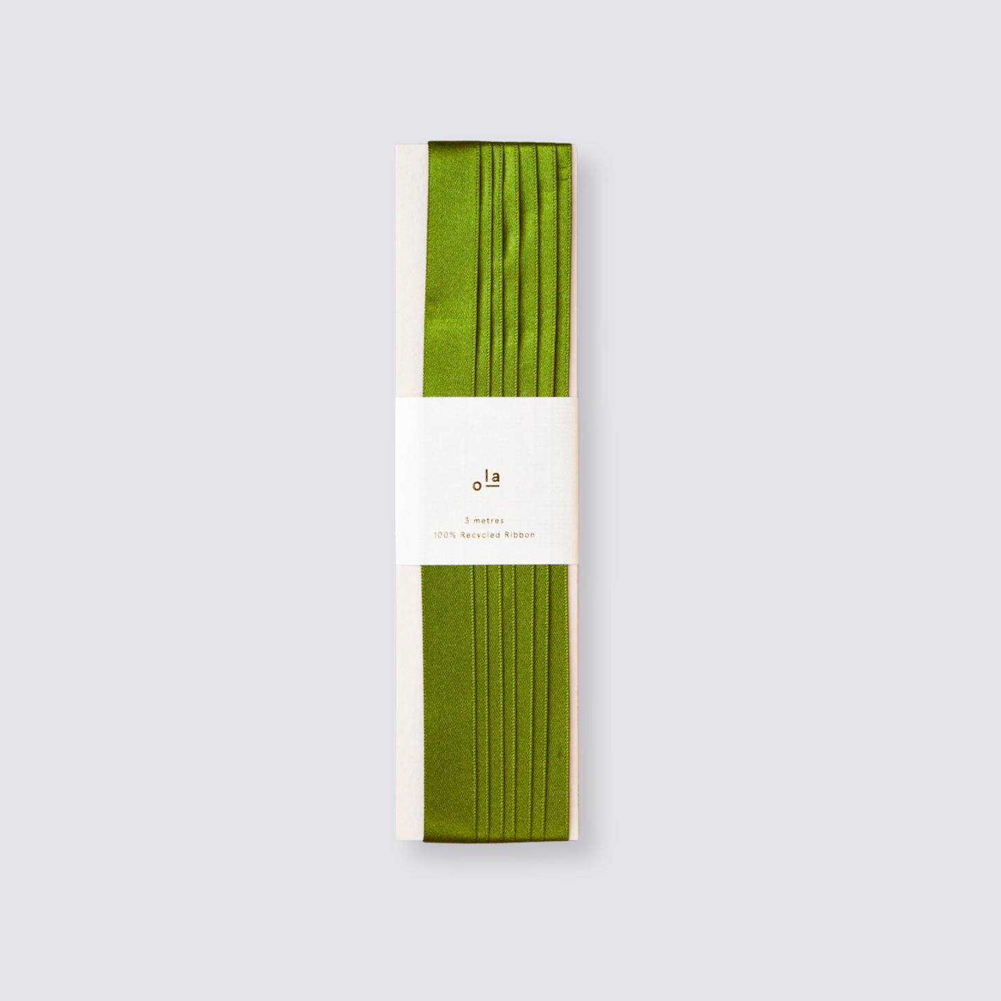 Three metres of ribbon thoughtfully made from recycled plastic bottles and presented on a bespoke colourcore board with a brass foiled band.