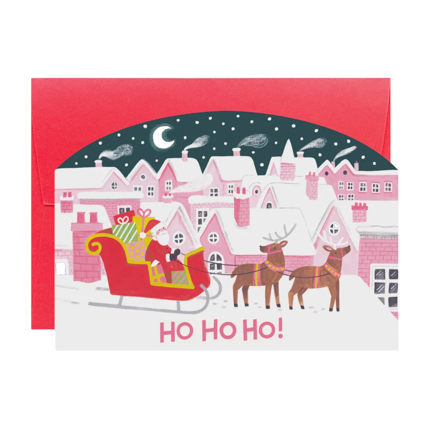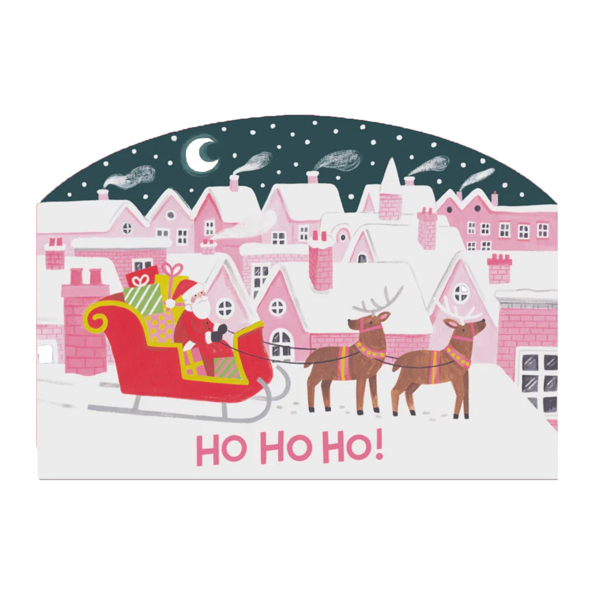 This die-cut Christmas card features Father Christmas and his reindeer on city rooftops delivering his presents. It was created in collaboration with London-based artist Jacqui Lee who uses gouache paint to hand-paint her designs.
