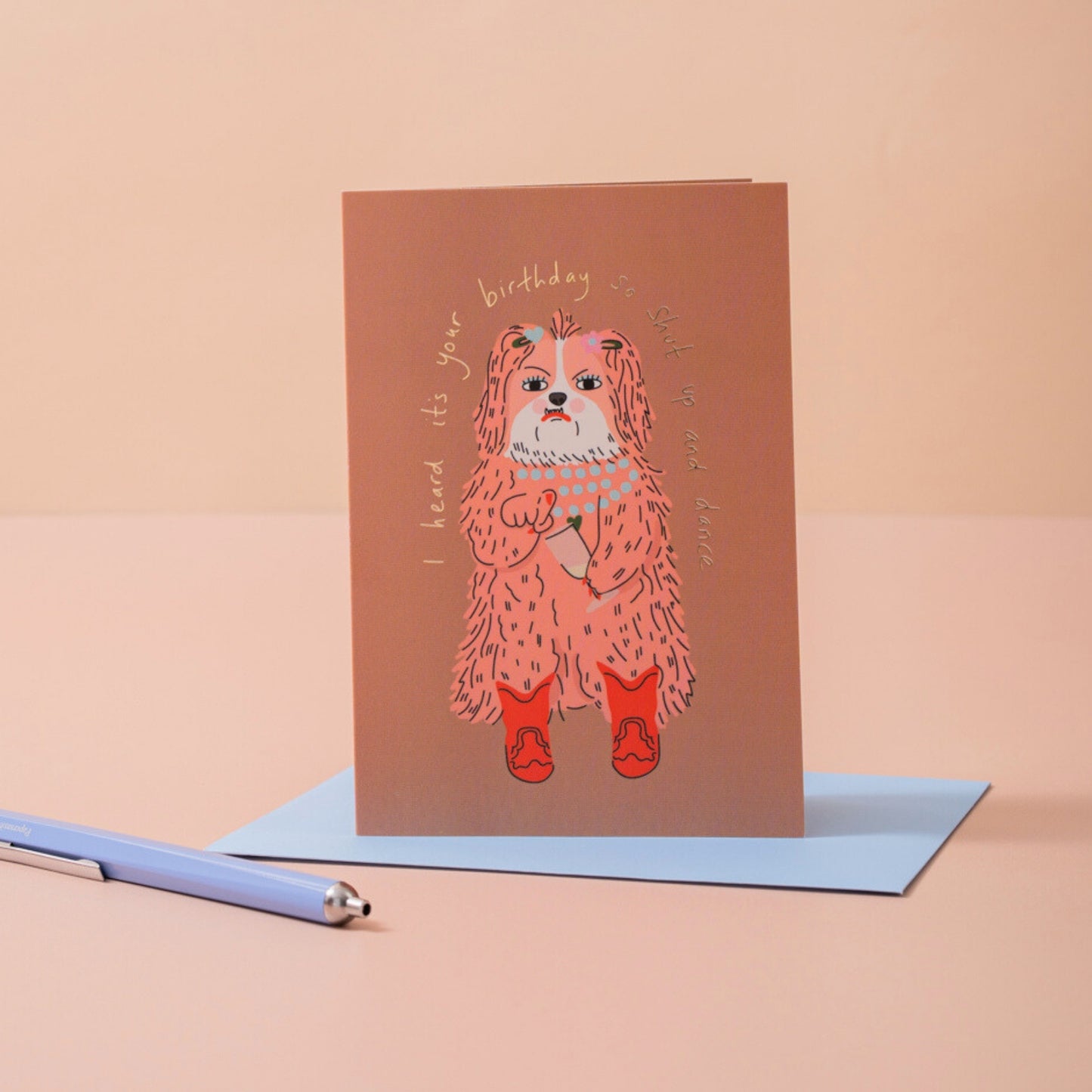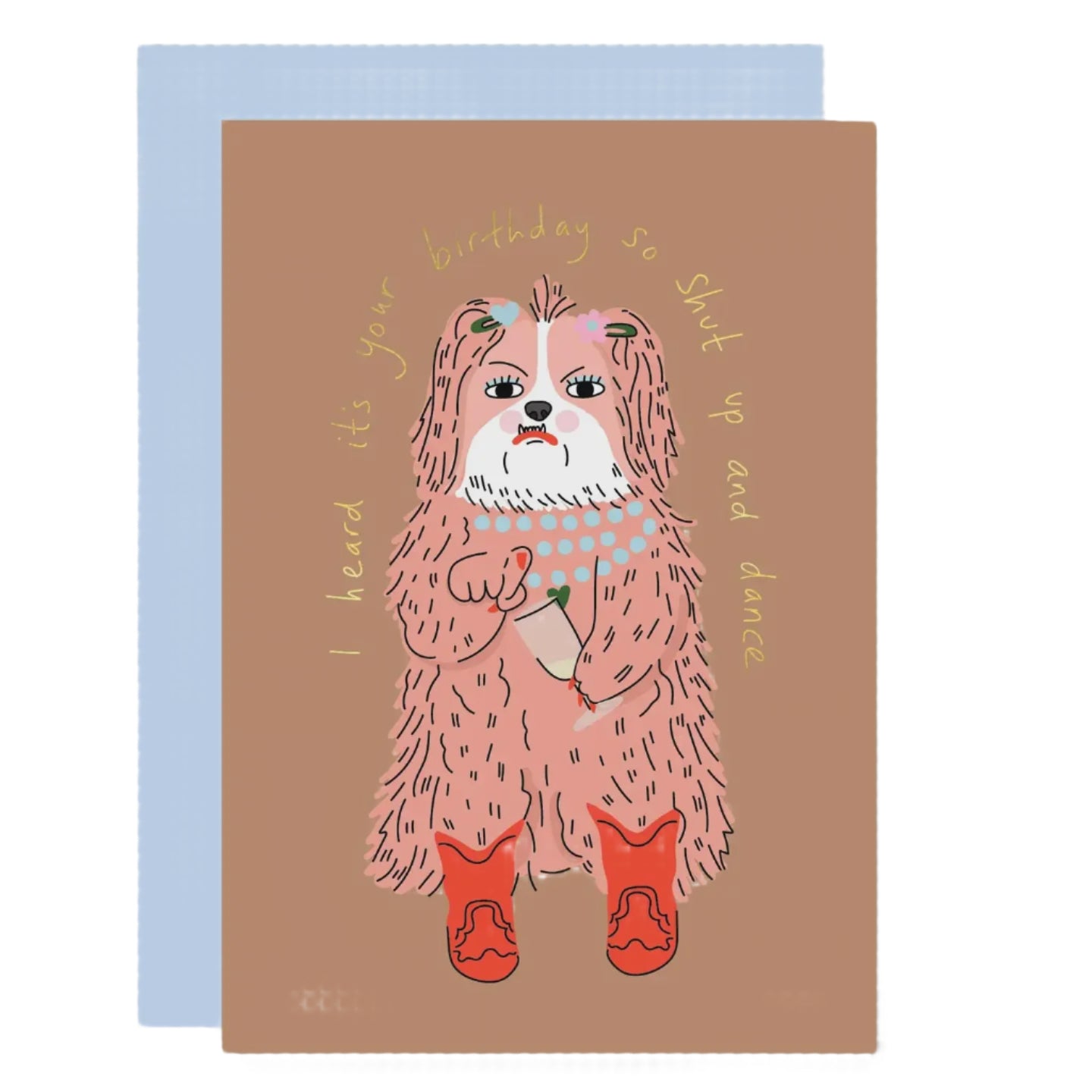 Shut up and dance birthday design in gold foil featuring a rather persuasive dog in cowboy boots.