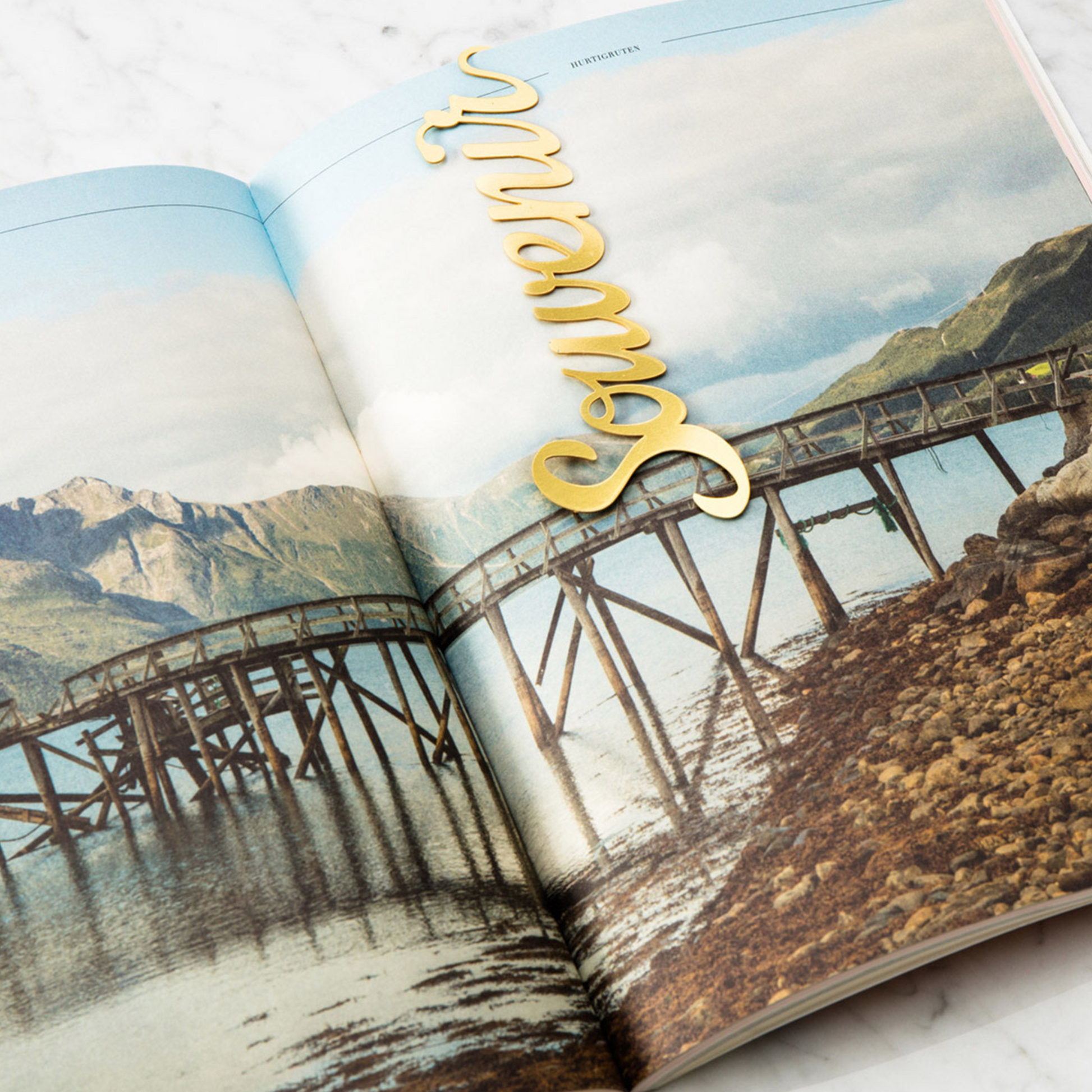 This finely-cut metal bookmark slips onto a page like a silk glove. Finished in blue with a subtle sheen and presented on a screen-printed, post-card sized mount.