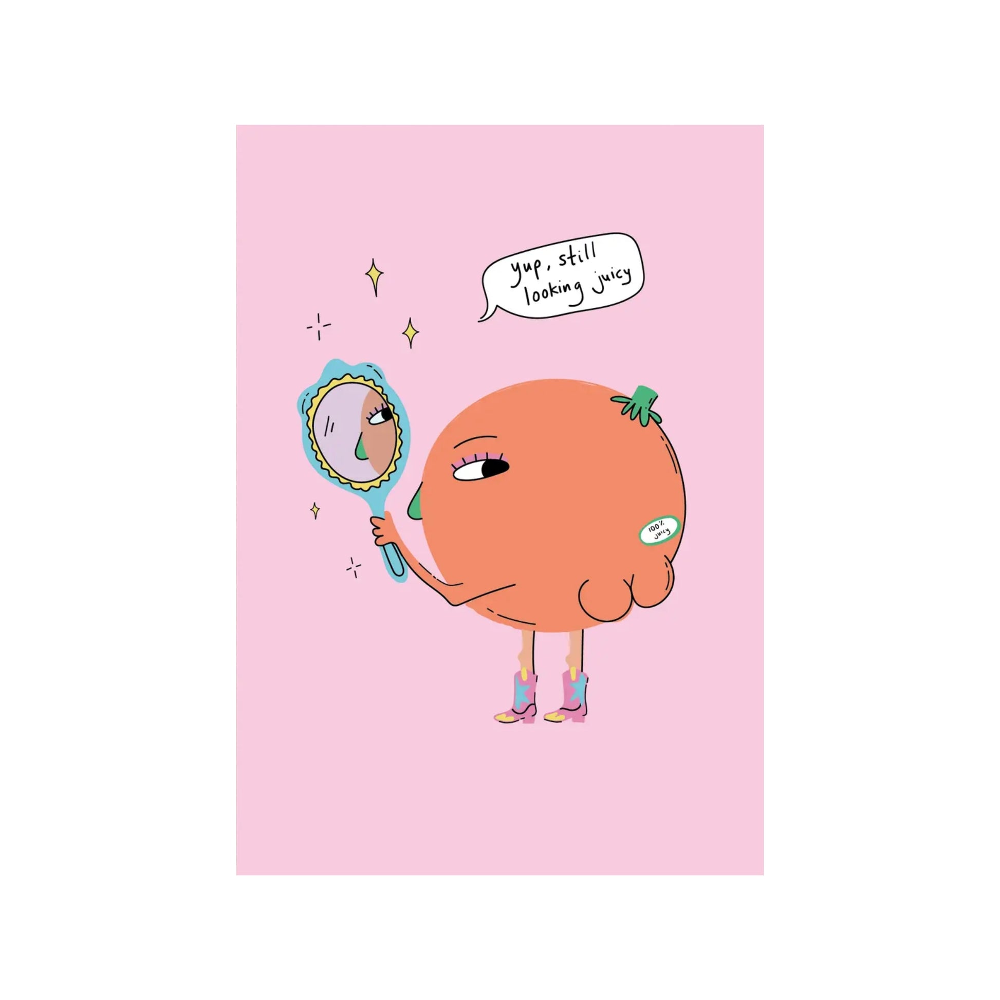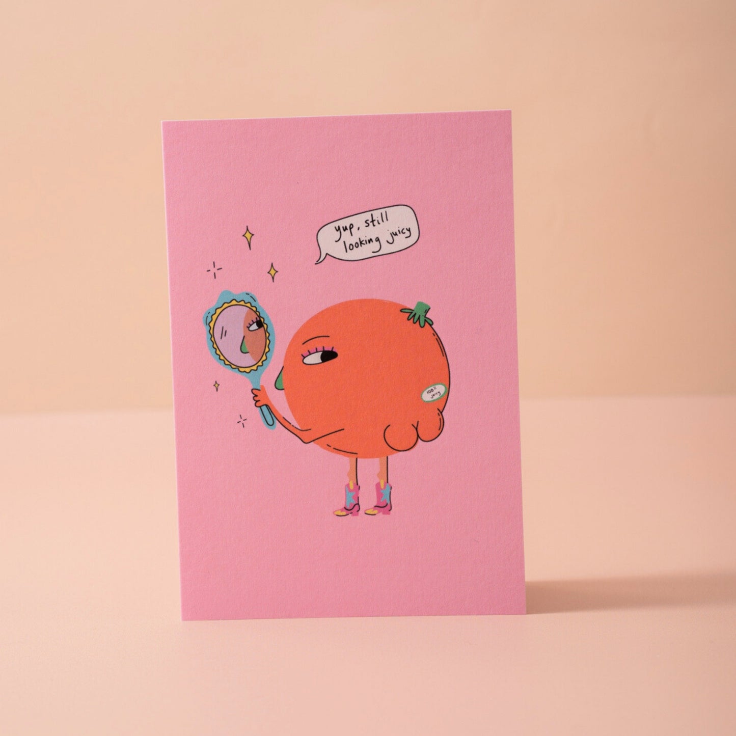 A quirky fruit illustration card with an orange wearing cowgirl boots.