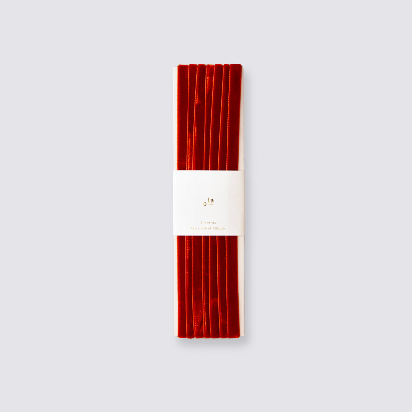 Three metres of luxury Swiss velvet ribbon presented on a bespoke colourcore boardwith a brass foiled band.
