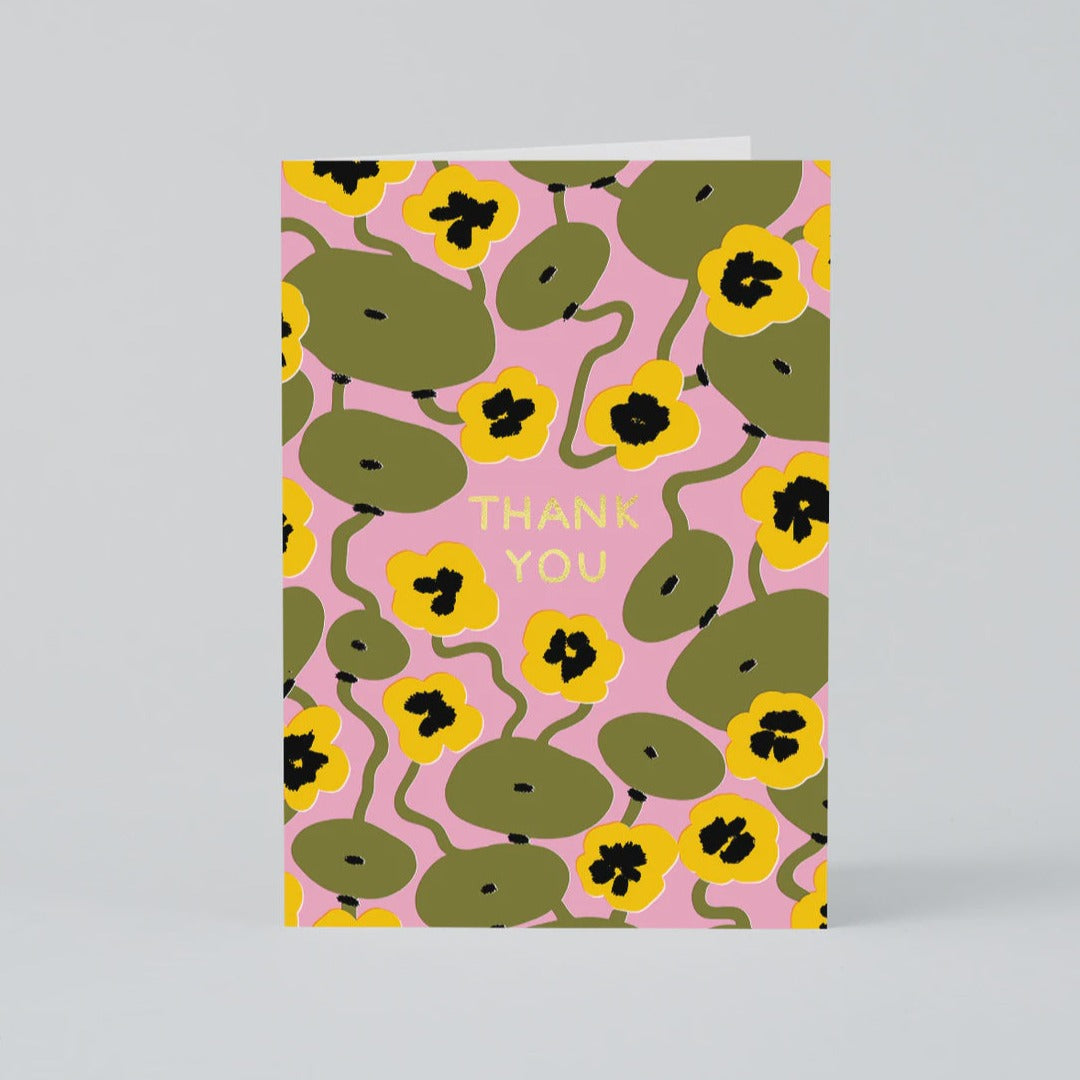 Greetings card with a white envelope finished with gold foiled lettering. Designed by Elena Boils for Wrap. Packed with a white envelope in a clear biodegradable cello bag. Blank inside.