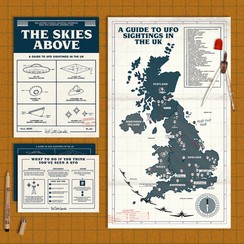 This illustrated map and guide identifies 41 credible unexplained sightings in the skies above the United Kingdom. Entries include the 1980 incident in Rendlesham Forest, reported by military personnel; the Welsh schoolchildren who described a ‘figure in a silver suit’ emerging from a dome-shaped craft one lunchtime; a 77-year-old rejected by humanoid beings as being ‘too old and too infirm for our purpose’.