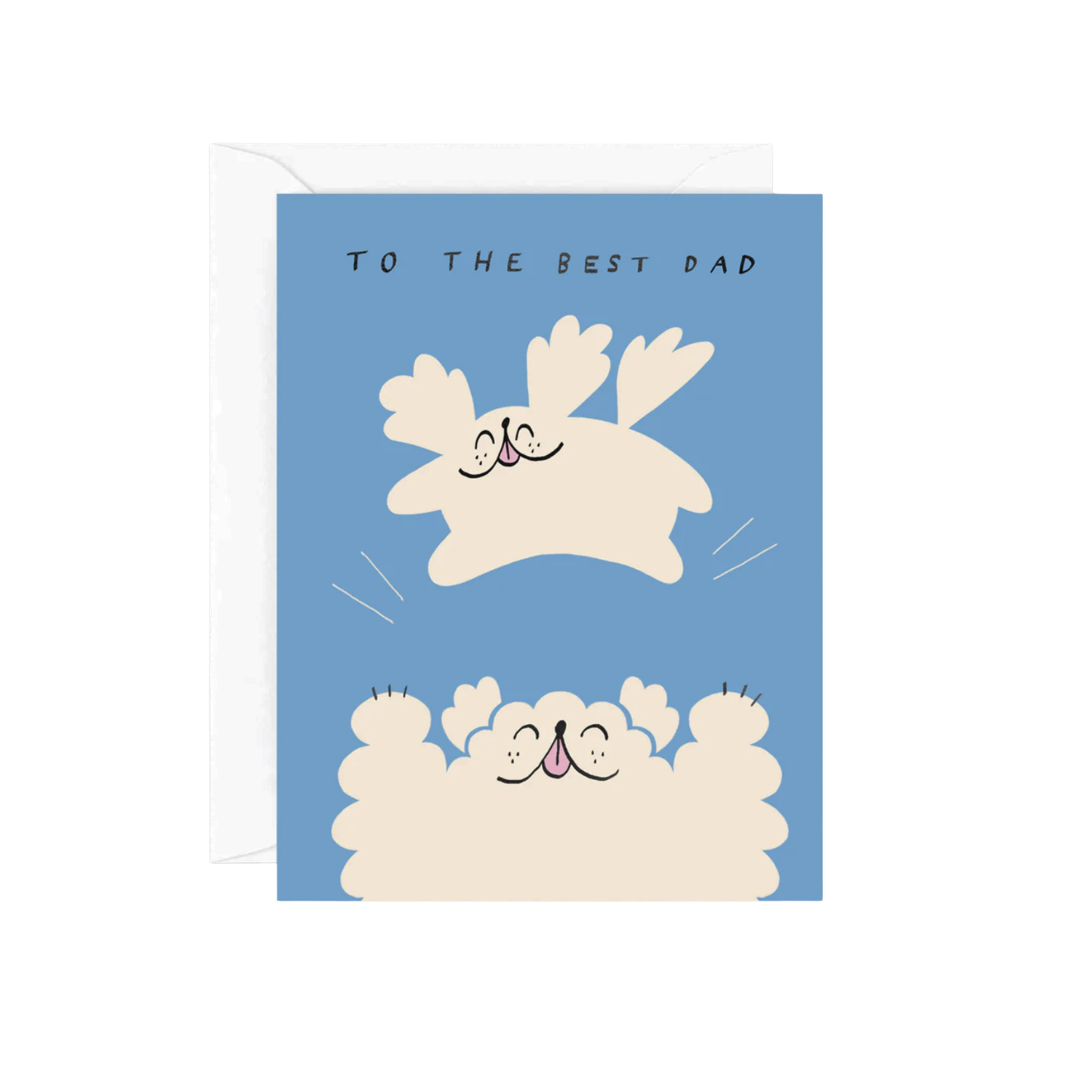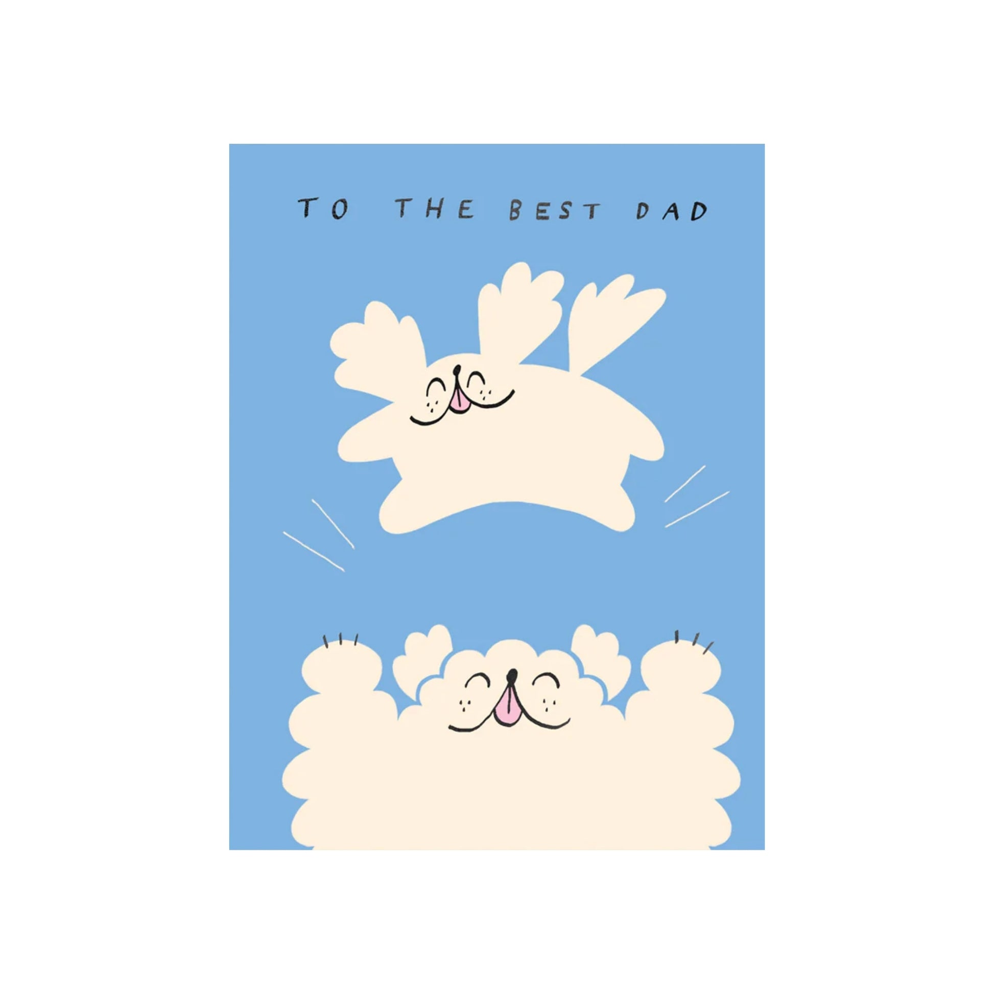 The cutest little illustration of two very fluffy white dogs having the time of their lives. This adorable greetings card is perfect for Father's Day or your Dad's birthday. It says "to the best dad" and it's blank inside.