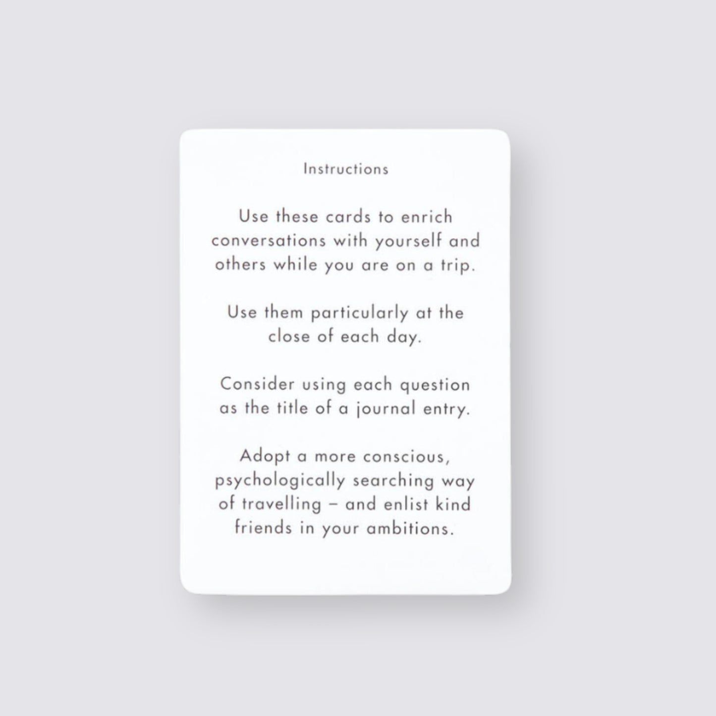 52 cards to deepen and transform the experience of travel. Going travelling can be one of life’s greatest activities – but often, we fail to deepen the experience as much as we should and return home with some of the promise of our trip unrealised. Here is a pack of cards designed to help us get the very best out of travel – and to embed its greatest lessons in our minds.