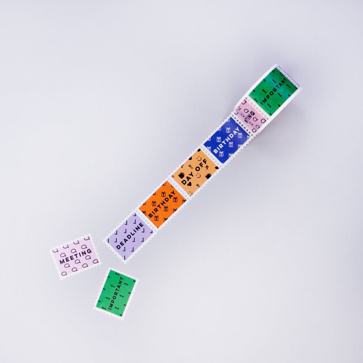 Beautifully packed in a (plastic free!) cardboard box, the tape is 25mm wide, 5 meters long and is perforated so you can tear each stamp off.