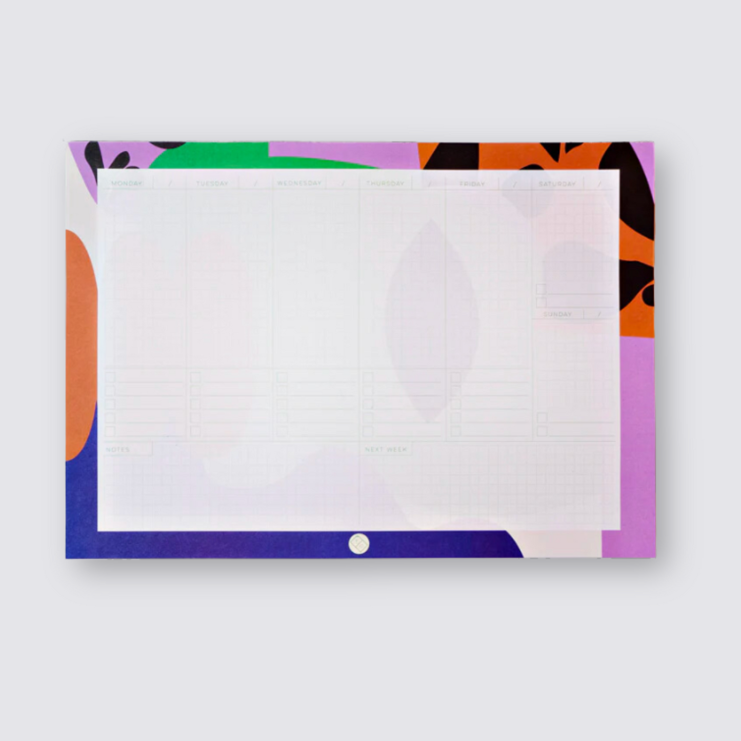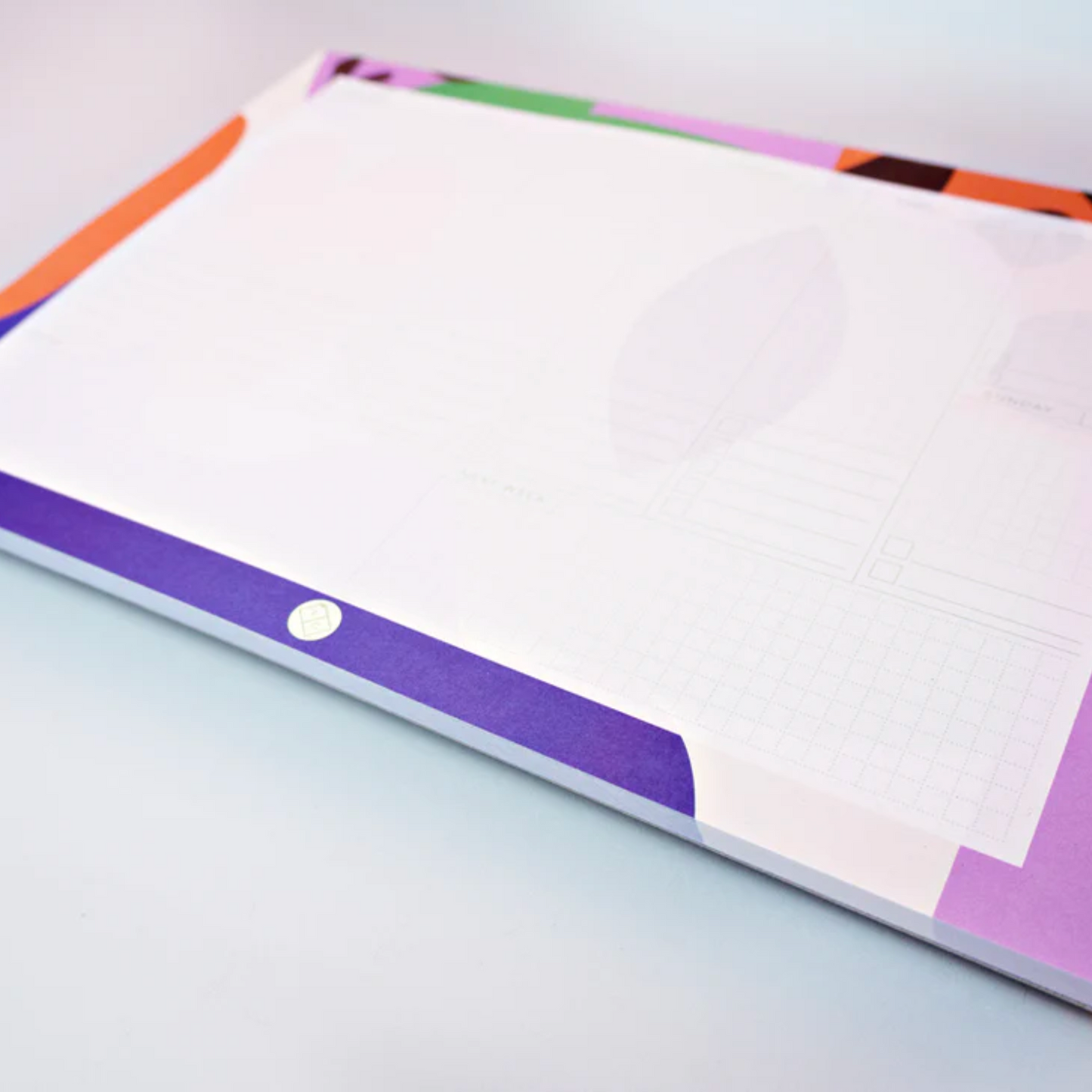 Introducing the Weekly Planner Pad with an abstract ripped paper-inspired print, perfect for those who need to plan their entire week in advance. Each pad includes approximately 52 desktop planning pages, printed on FSC certified paper using vegetable inks, and has recycled cardboard backing for eco-friendly organization.