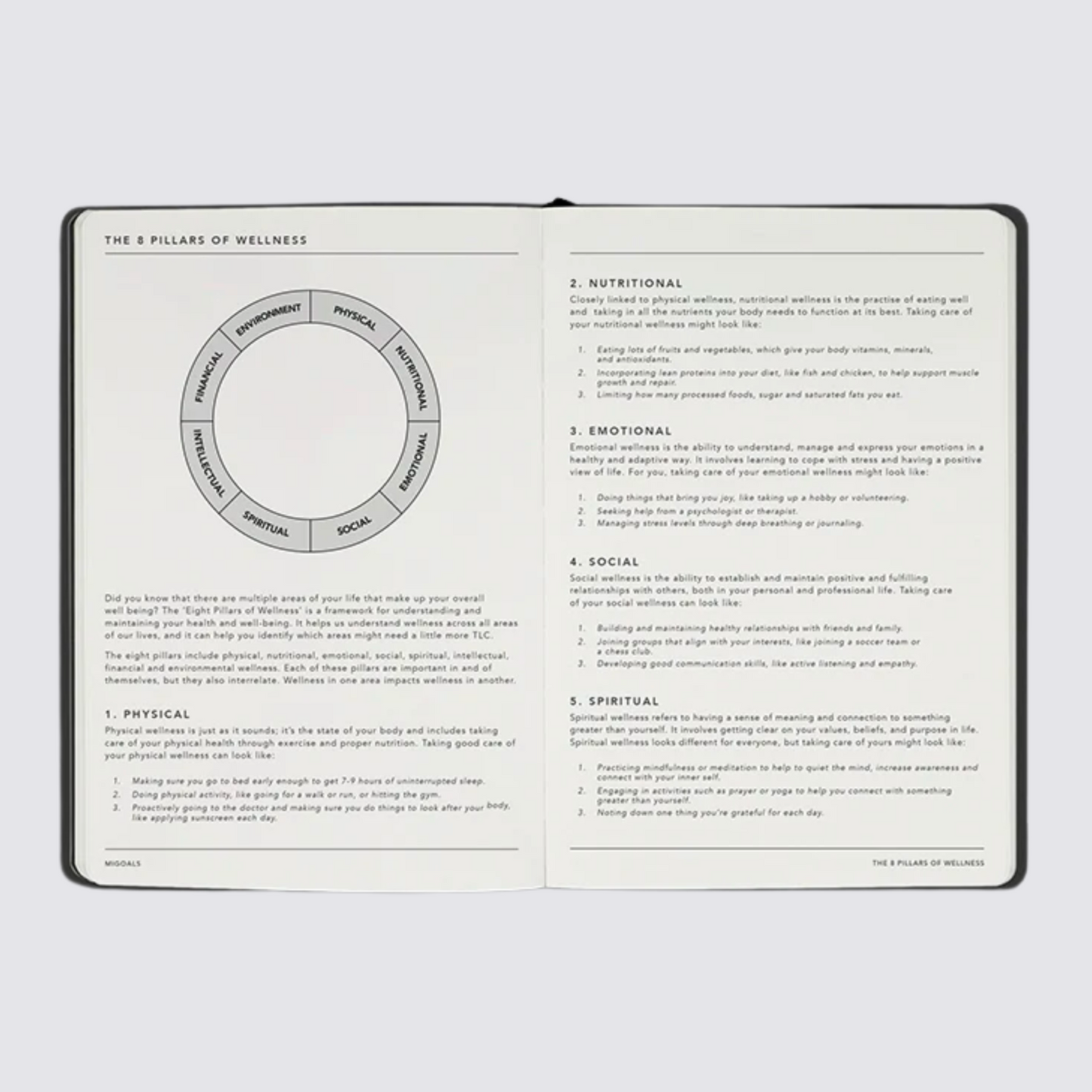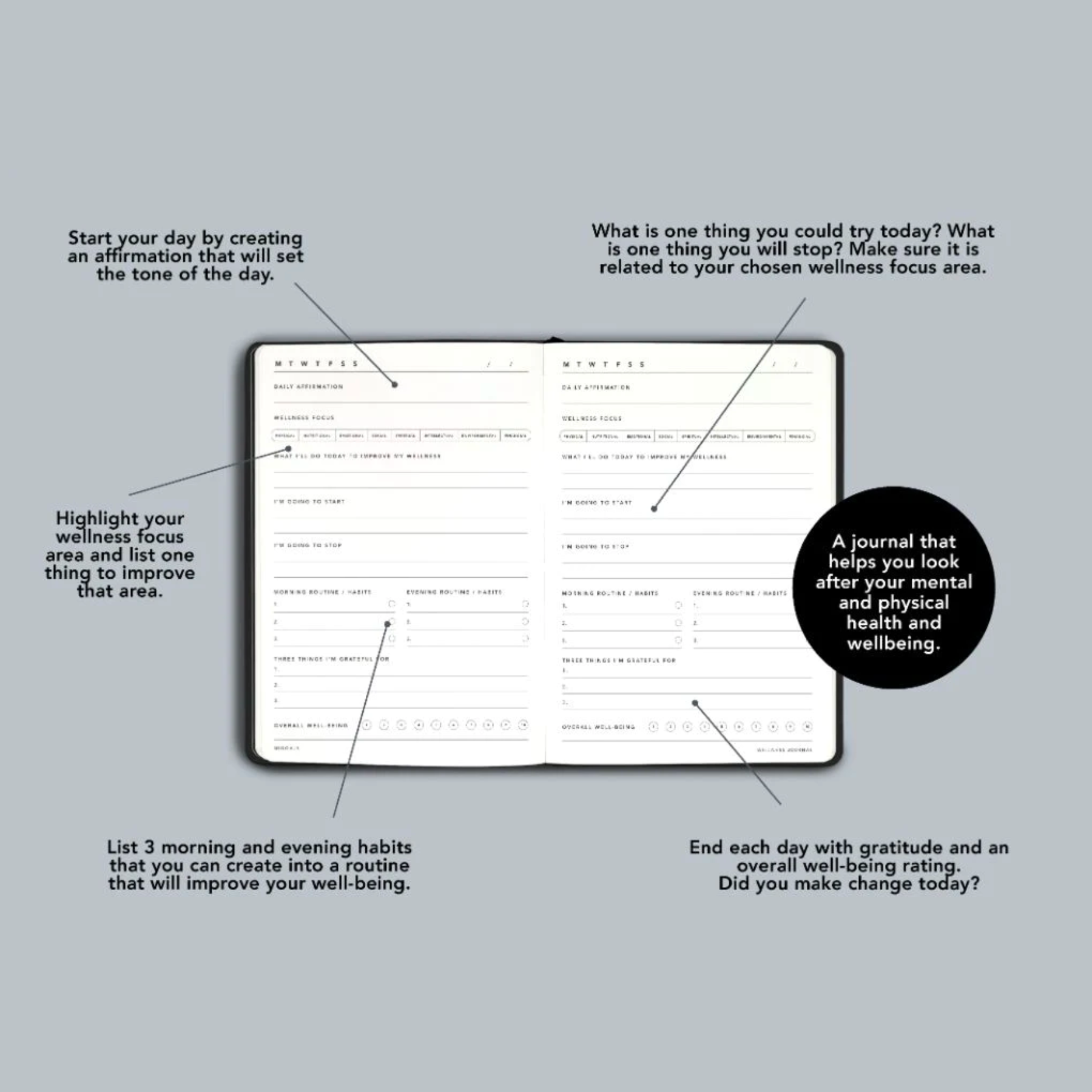 Introducing the remarkable Wellness Journal – Your new path to holistic well-being. This expertly crafted journal features powerful prompts, including daily affirmations, routines, habits tracking, a gratitude section, and 8 Pillars of Wellness. Experience its transformative impact with a luxurious PU leather cover and 100GSM FSC paper, all in a portable B6 size.